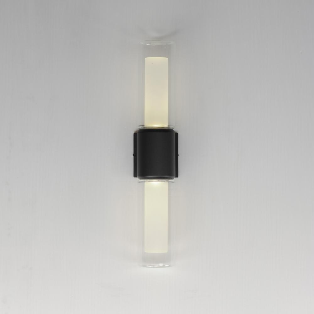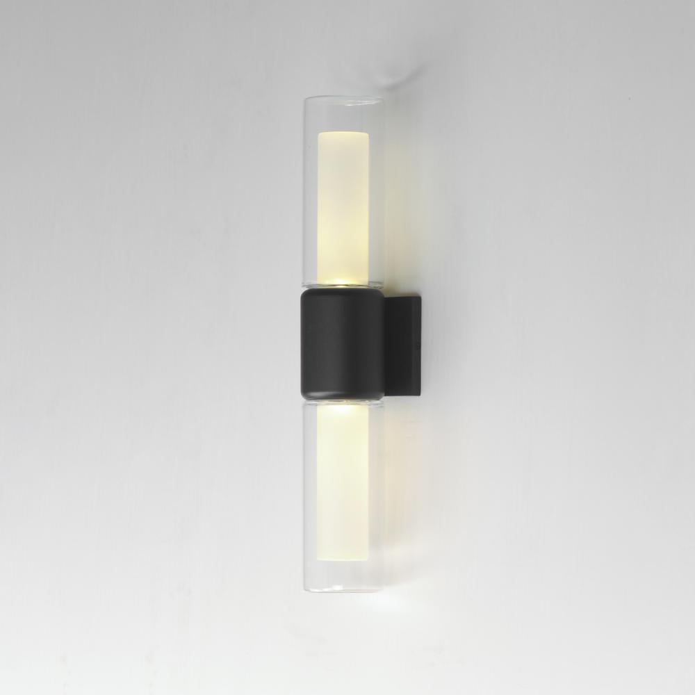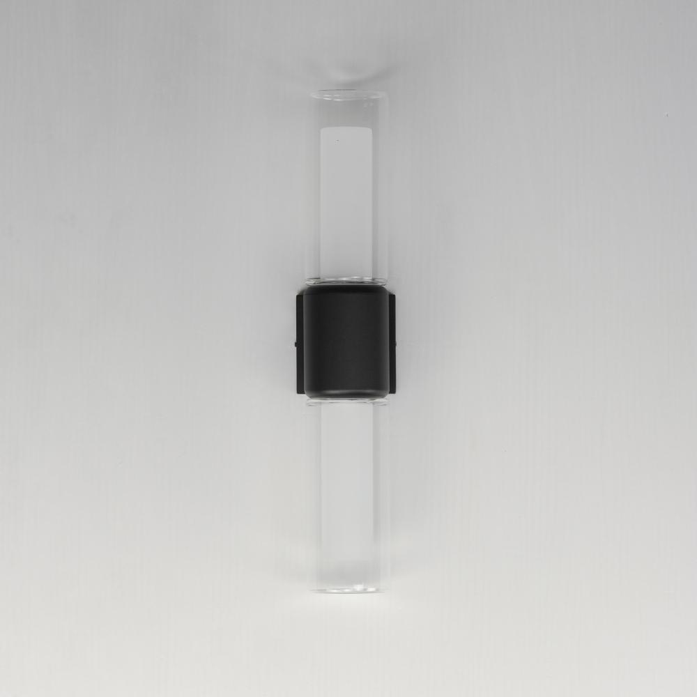 Dual Cylinder glass shades diffuse LED light bulbs concealed within rounded caps in Black powder coat. The single sconce is wet located with intention to be used outdoors, while the complementary 3-Light wall sconce is perfect for use in transitional to mo