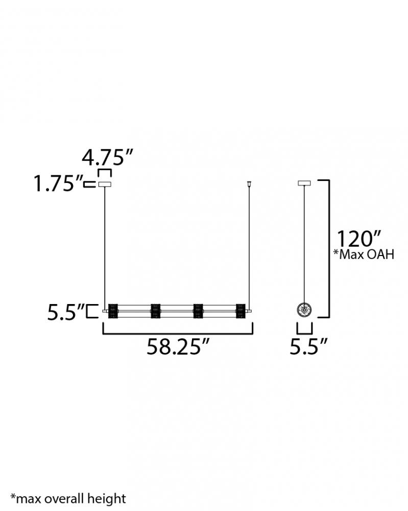 Segments of Clear glass cylinders are separated by distinctly rippled Clear crystal fonts on a thin Natural Aged Brass frame. The translucent segments are backlit with integrated LED illumination creating an airy, ethereal composition of glass textures. Av