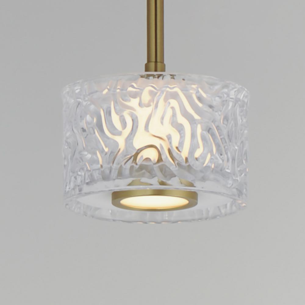 Segments of Clear glass cylinders are separated by distinctly rippled Clear crystal fonts on a thin Natural Aged Brass frame. The translucent segments are backlit with integrated LED illumination creating an airy, ethereal composition of glass textures. Av