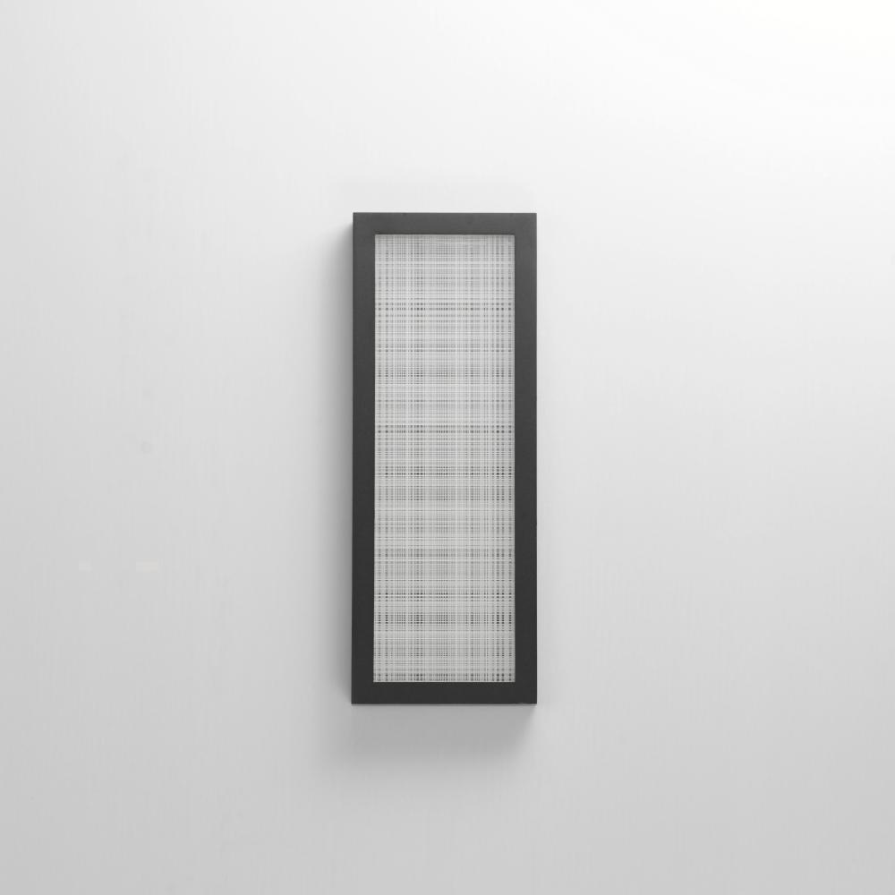 An internally illuminated shadow box is encased in glass with a tartan plaid pattern engraved to mimic linen. The back plate features a polished stainless steel plate adding an almost infinite dimension to the pattern. Constructed of aluminum in Matte Blac