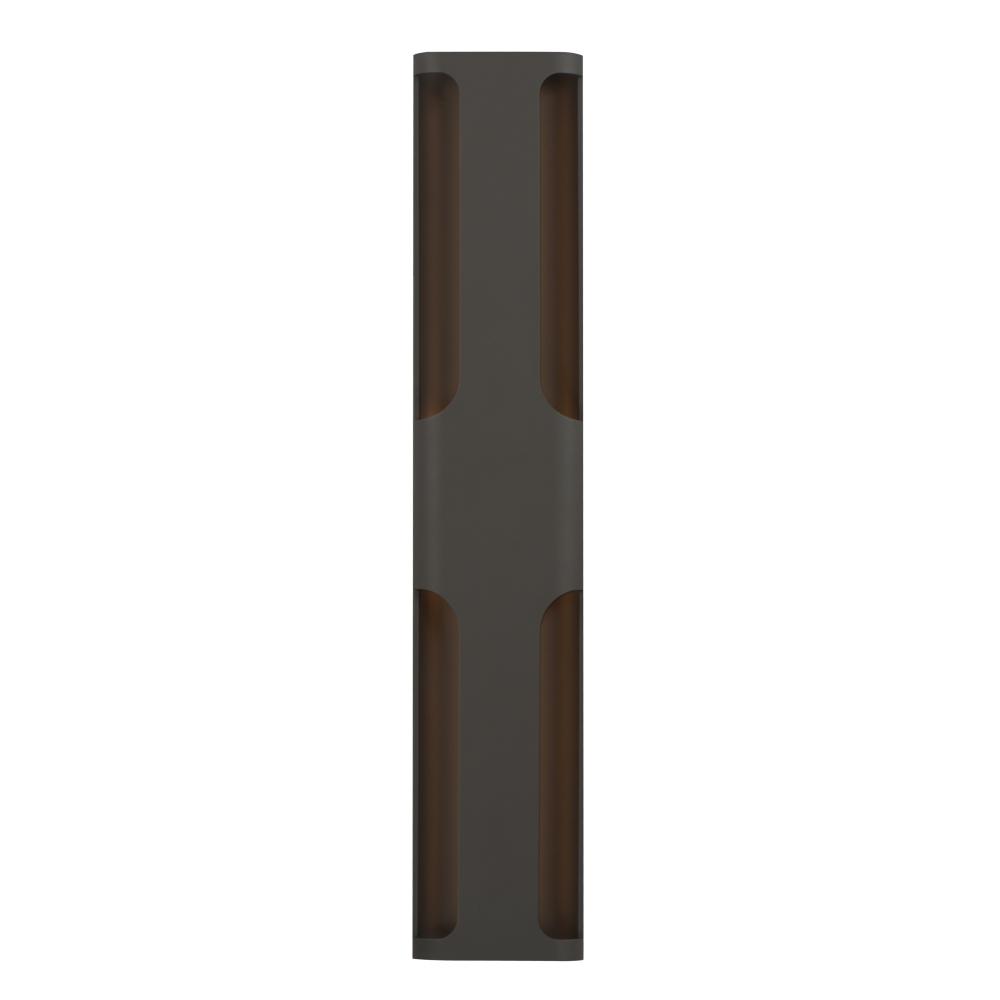 Large aluminum extrusions with indirect lighting highlights cut outs in this architectural outlook. Directed outwards toward the cutouts, these sconces are rated for outdoor applications. Select from Black or Architectural Bronze finishes and two sizes of