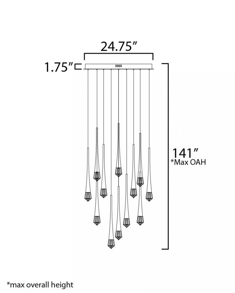 An elongated profile with piercing statement, this series of pendants feature thin black wires that support a tapered metal pendant. Recessed in this form is a high powered LED that illuminates a brilliantly faceted crystal element with etched details insi