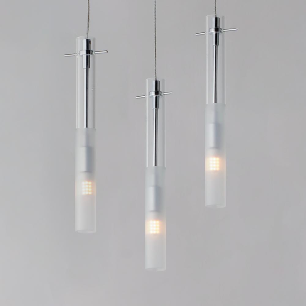 Slender Clear glass tubes sheath a Polished Chrome rod that supports small LED lamps. The glass is etched at a dividing line in the glass to softly diffuse the light. Available in two lengths of glass tube, the pendants are also available in multiple confi