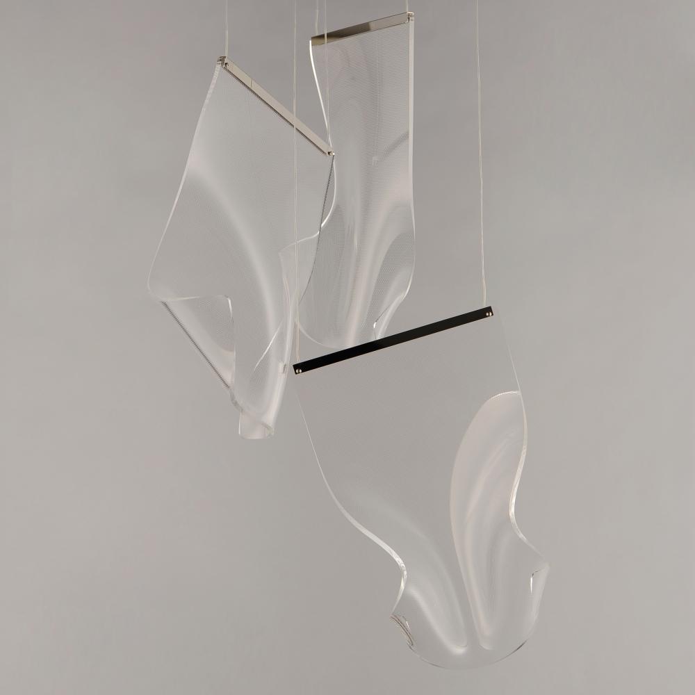 An airy arrangement of abstract forms, the Rinkle pendants feature sheets of transparent acrylic shaped by hand. The light guided acrylic captures the glow of energy efficient LEDs recessed within strips of shining stainless steel, obscuring the source of