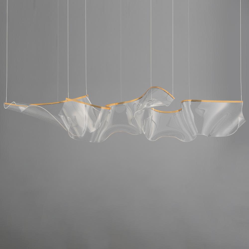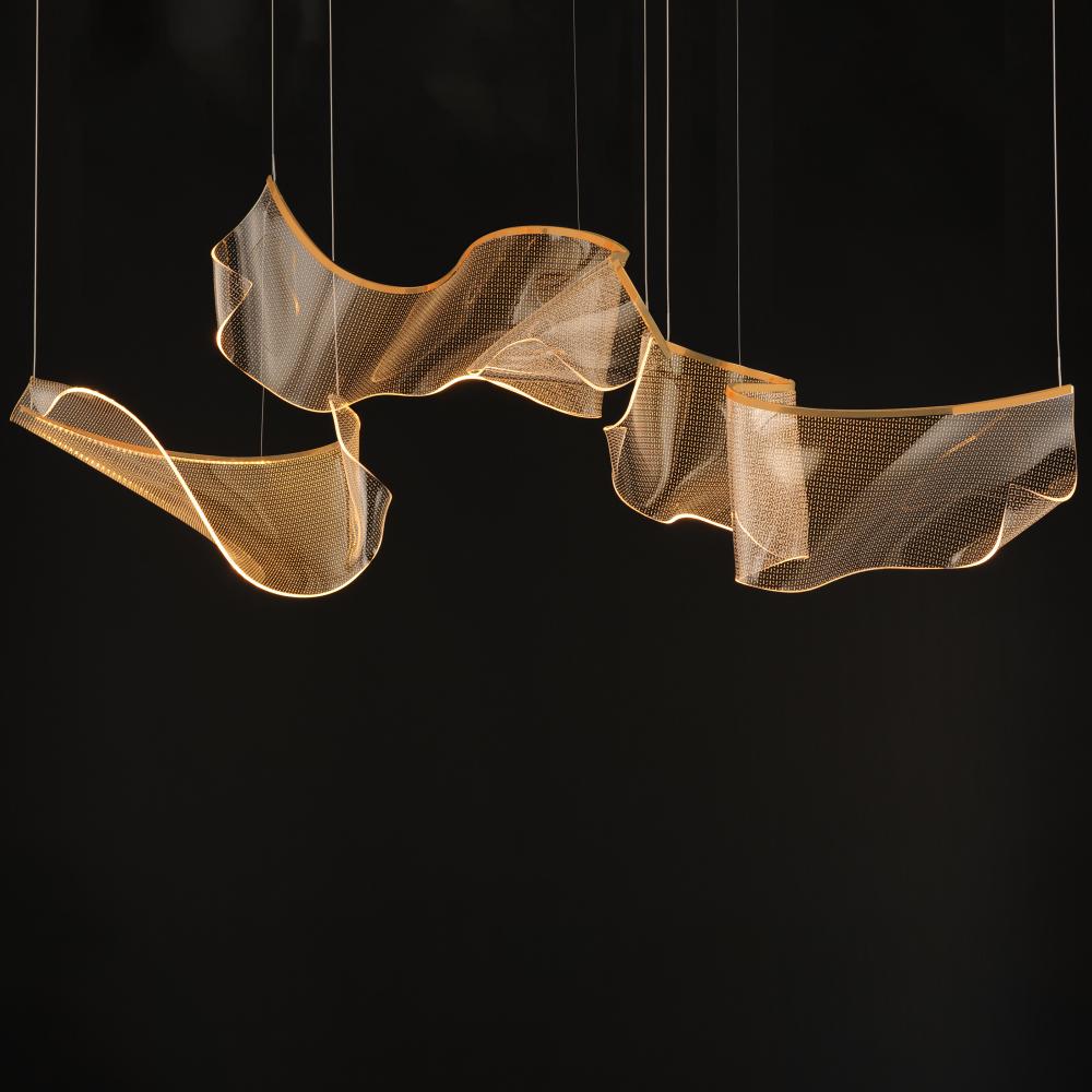 An airy arrangement of abstract forms, the Rinkle pendants feature sheets of transparent acrylic shaped by hand. The light guided acrylic captures the glow of energy efficient LEDs recessed within strips of shining stainless steel, obscuring the source of