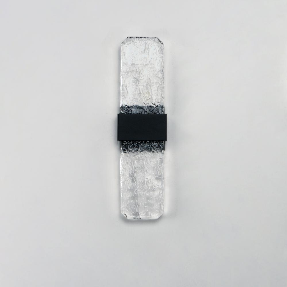 Artisanal cast glass slabs are supported by a Die Cast Aluminum bracket finished in an outdoor rated Black powder coat. Emphasizing the unique beauty of the glasses' imperfect contours, the sconces accentuate these features with concealed LED lighting.