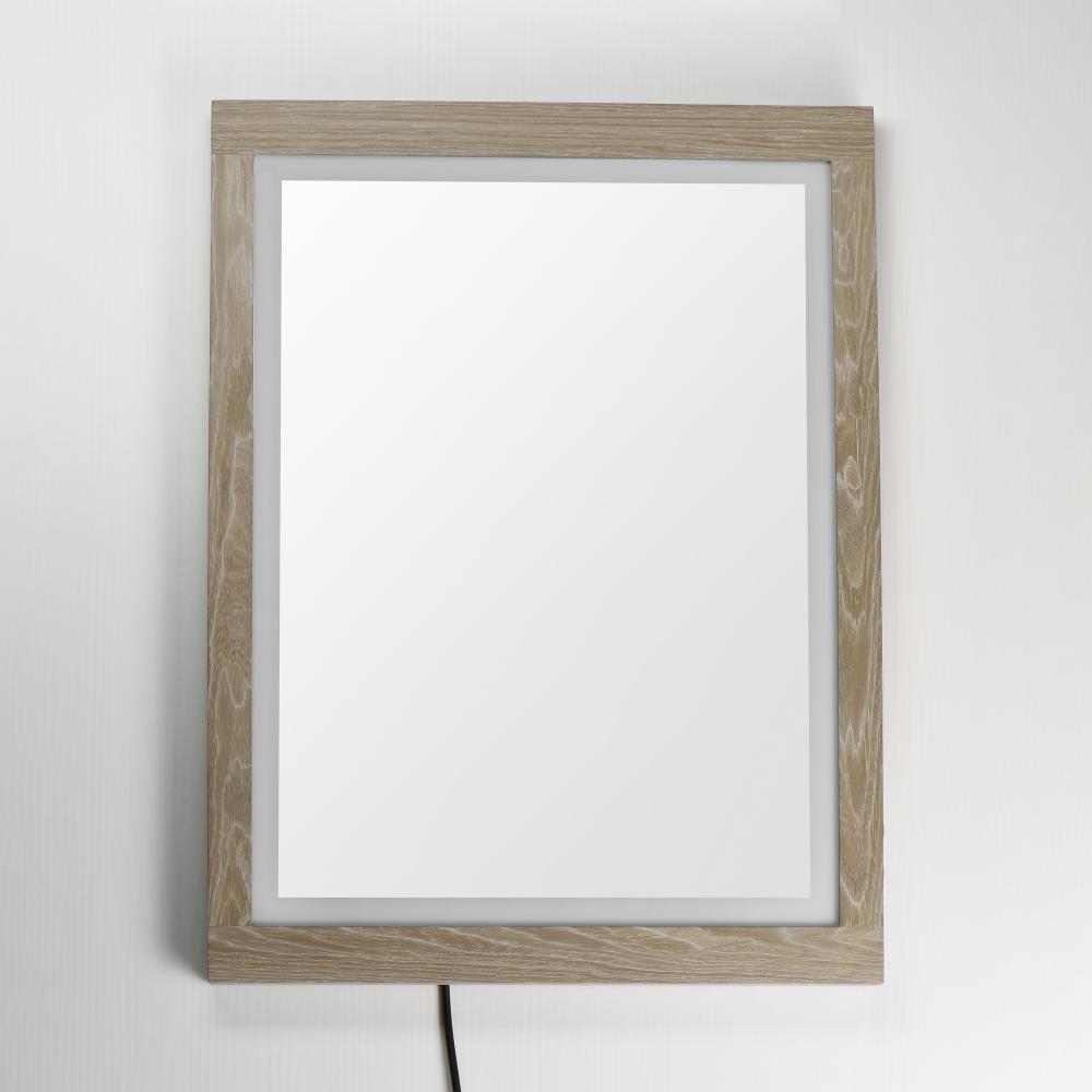 A wood-framed mirror is offered in a choice of Walnut or Distressed Oak, combining natural elements with modern functionality. A 2-inch frosted band along the frame's interior is backlit with LEDs, providing optimal illumination above a vanity. A discr
