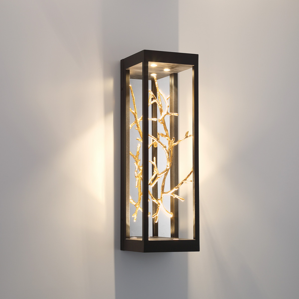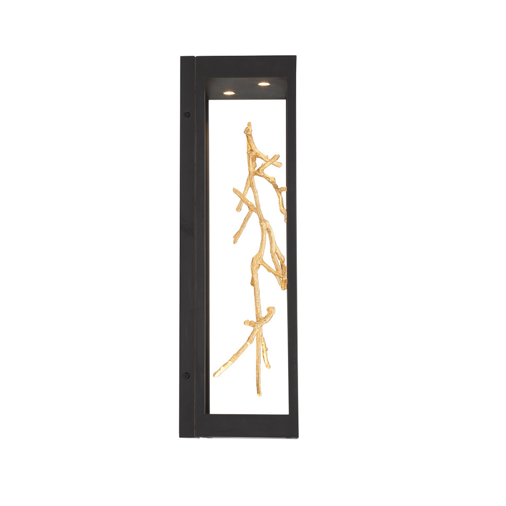 Free-flowing, gilded branches of gold and silver float elegantly within a stylish open cage constructed of cast brass and finished for the rigors of outdoor environments. The thin twigs are handcrafted with metal foil and accentuated by pinhole recessed LED lighting to add a luxurious glow to this nature-inspired collection.
