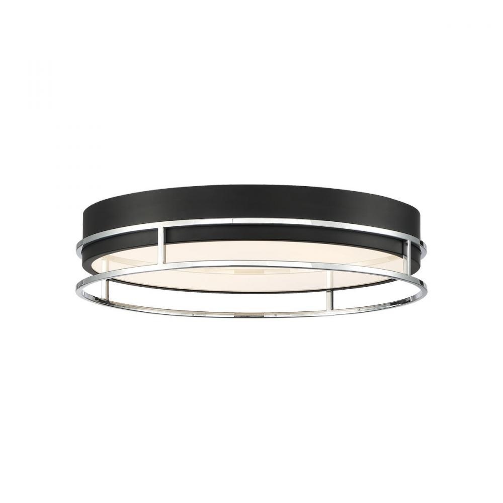 Basic form and rich finishes give prominence to clean elegance. A frosted glass sits securely within a matte black drum that houses LED light. This effortless design draws attention to the simple decorative rings that frame the black cylinder in bright contrast