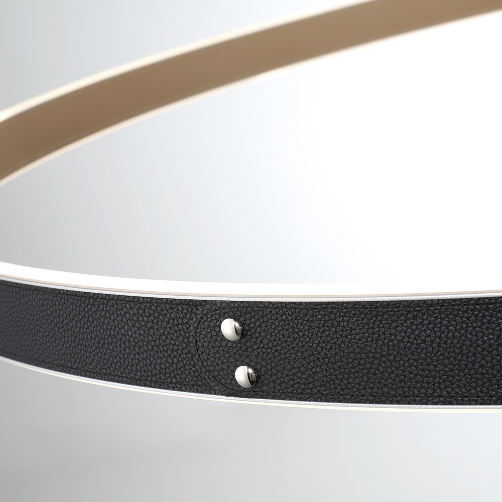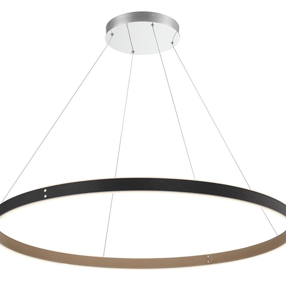 The Verdura collection features vegan leather, accentuated by decorative silver studs. The two-toned fabric highlights one color on the inside while displaying a complementary second color on the outer ring. The textured grooves are highlighted by the luminous glow of integrated LED lights that are encased between. This collection is not only abundant in size but also in the number of fixtures offered. Be it a small home office or a grand staircase, the Verdura collection is available in a range of fixture sizes to fit any room space.