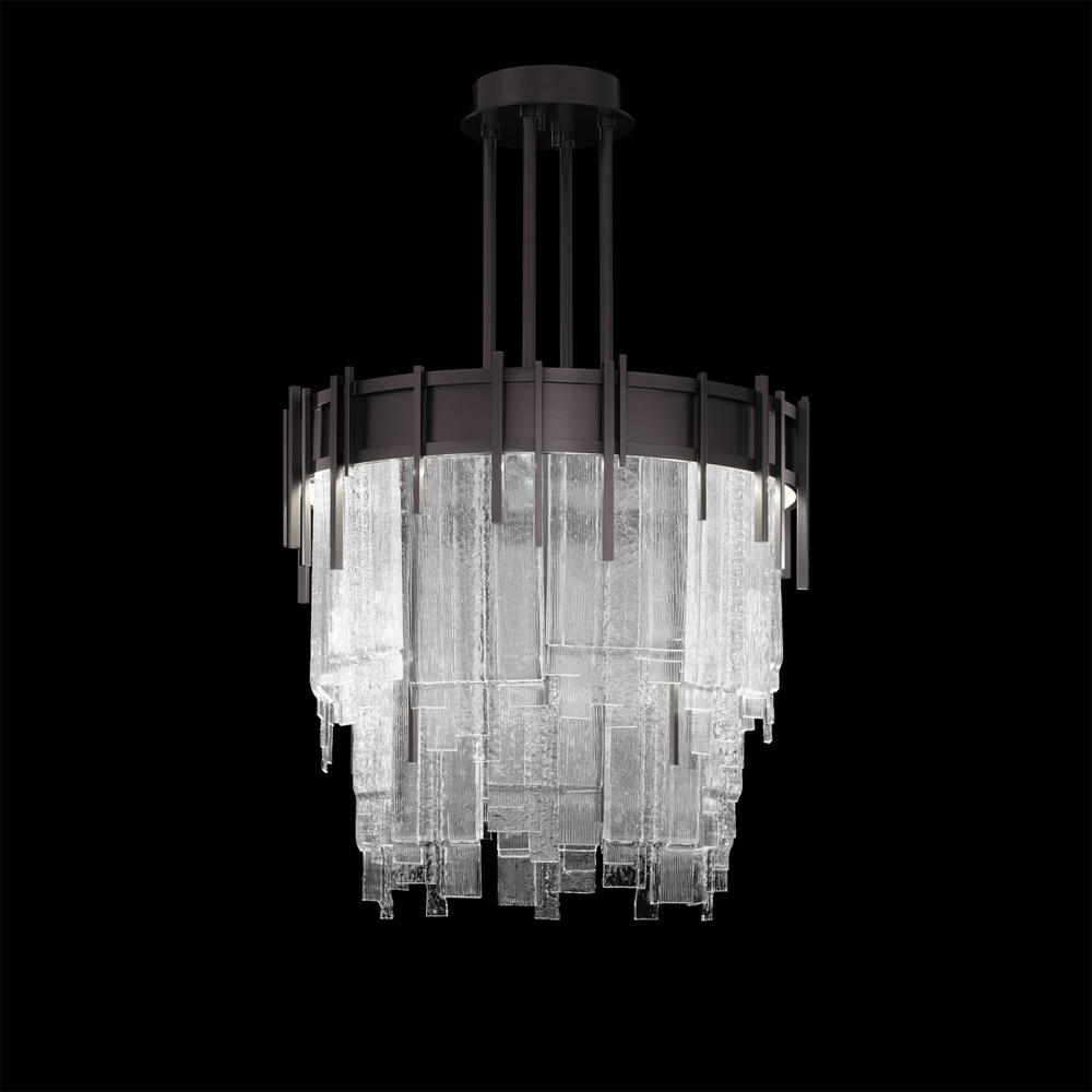 Inspired by the love of Jazz and the harmonious arrangement of musical notes, this Arpeggio pendant features panels of cascading glass fused together to create a chorus of visual delight.The collection emulates melody and movement, characterized by its multi-layered design of fused-glass panels, combining clear and colored glass to create a captivating, textured look.Color glass options feature textured glass panels masterfully layered and fused together in clear, or multi-tonal mix of clear, smoke, and bronze, with Midnight Steel or Soft Gold Leaf finish options.
