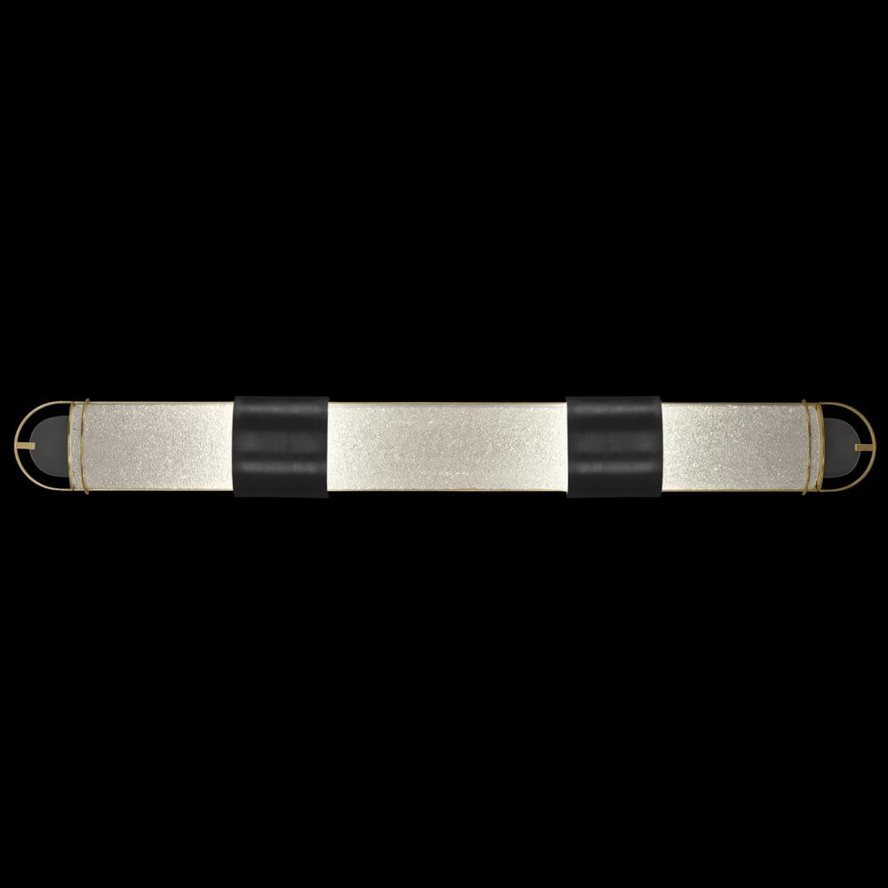 Luxury LED bath fixture featuring illuminated half-cylinders formed by handcrafted glass set within a silhouette, beautifully lit from within, spanning space vertically or horizontally. Shown in our standard Black and Gold Leaf finish with “Diamond Blanket” naturally faceted crystal frit glass, thermally induced to an exact heat, creating a blanket of sparkling crystal.