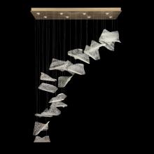 “Blank Pages” reminds us that each new day is a blank page. By fusing and slumping clear and white opaline glass and hand applying gold embellishments to detail the layering of the glass, this fixture comes to life in movement and design. Illuminated from a silver leaf canopy and suspended by adjustable cables. This American handmade rectangular fixture features 20 glass “Pages” and is ideal for high ceilings. Shown in a “swoop” design.