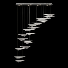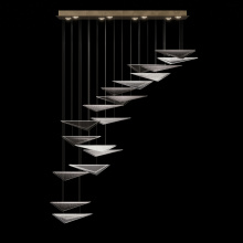 Our Volo Collection captures the quiet momentum of flight through cascading geometric forms and customizable, suspended compositions. Handcrafted studio glass—available in clear, smoke, or amber with hammered or linear textures—evokes the interplay of wind, light, and elevation with striking elegance."