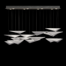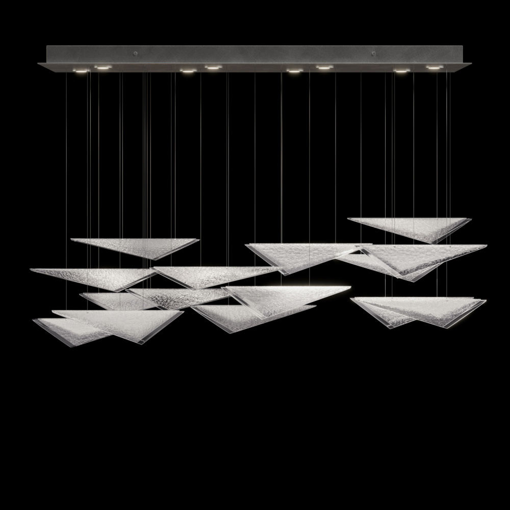 Our Volo Collection captures the quiet momentum of flight through cascading geometric forms and customizable, suspended compositions. Handcrafted studio glass—available in clear, smoke, or amber with hammered or linear textures—evokes the interplay of wind, light, and elevation with striking elegance."