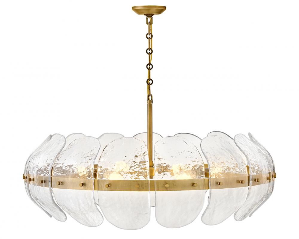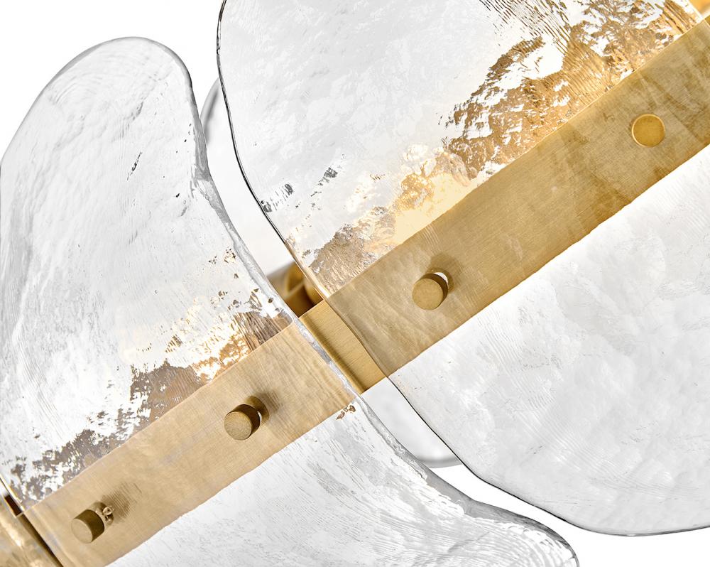 Inspired by the organic elegance of blooming water lilies, Lillia’s large shade is formed from gently curved glass panels. Subtle handcrafted texture creates natural variations in illumination, accentuated by a classic Heritage Brass finish.