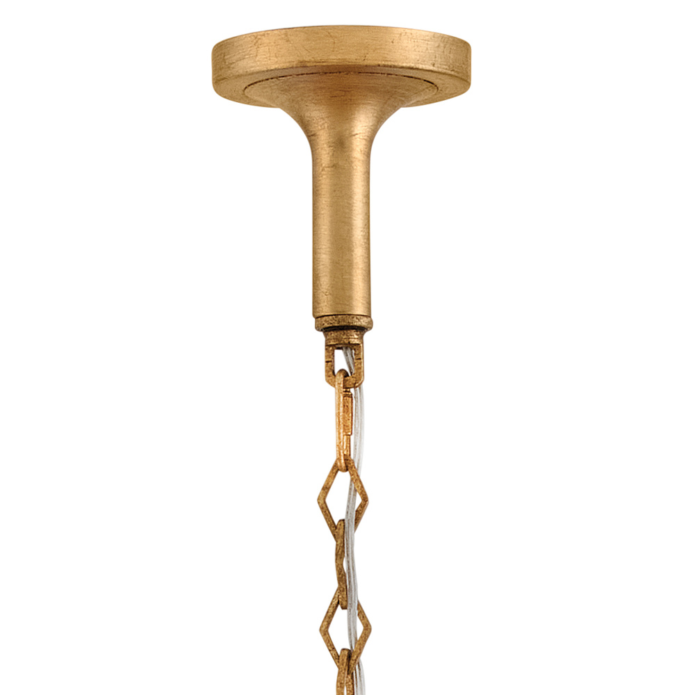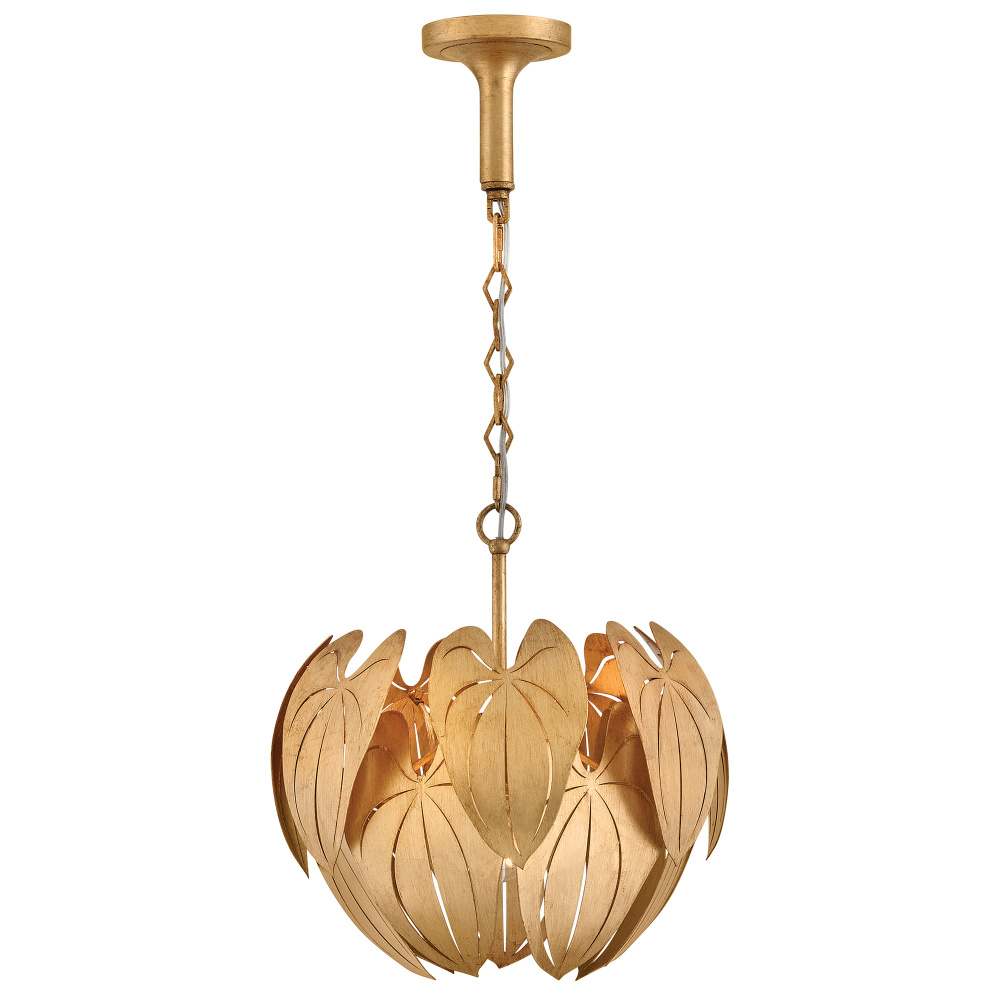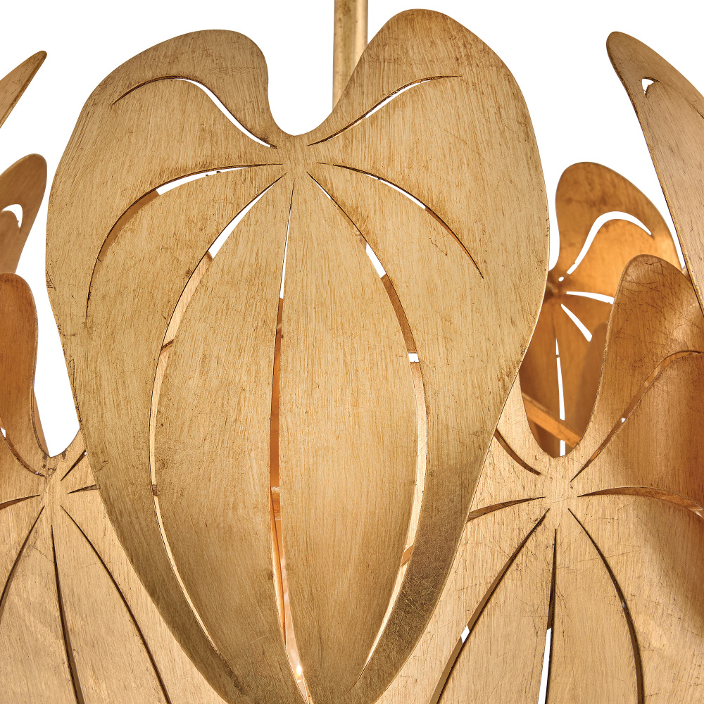 Inspired by the grand leaves and distinct veining of anthurium plants, found in the tropical cloud forests of South America, Camille brings botanical beauty to your living space. Each Distressed Brass layer is artfully laser-cut, shaped, and hand-painted with gold leaf to create a luxe transitional design, suspended by diamond-shaped chains and a tapered canopy.