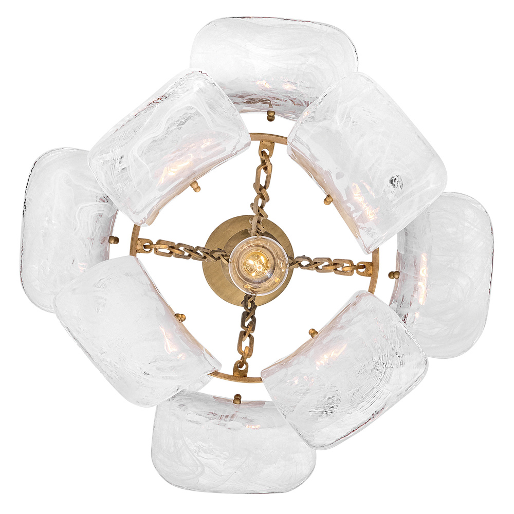 Deftly slumped and artfully arranged sheets of swirled glass appear to unfurl from Fleur’s beautiful drum silhouette, complemented by a central band hand-painted in Burnished Gold. White, cloud-like layers softly diffuse inviting illumination from warm candelabra lamps, creating an enchanting atmosphere.
