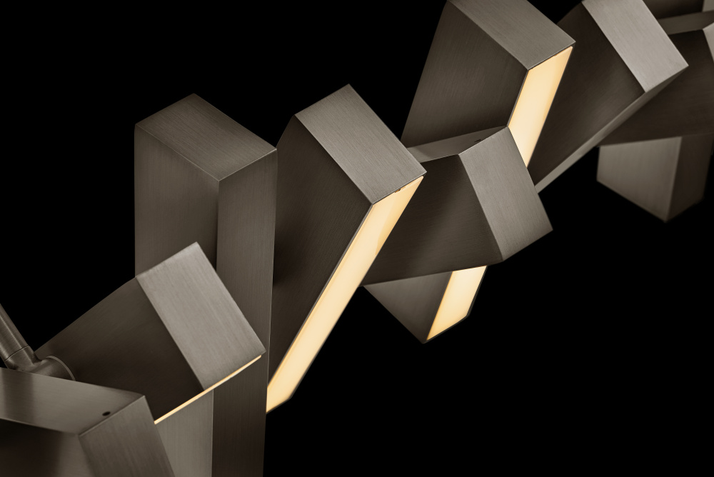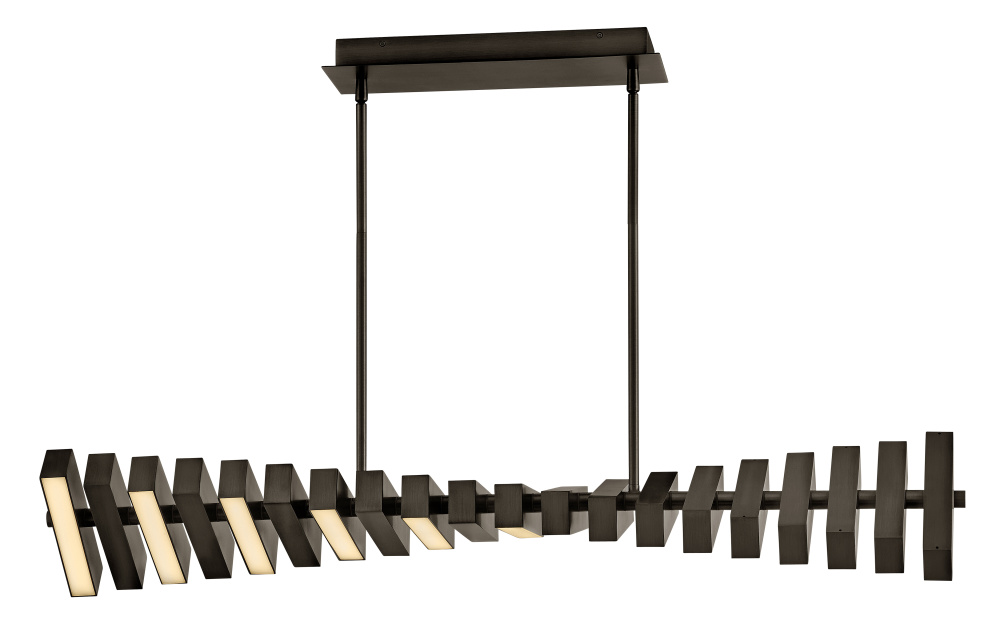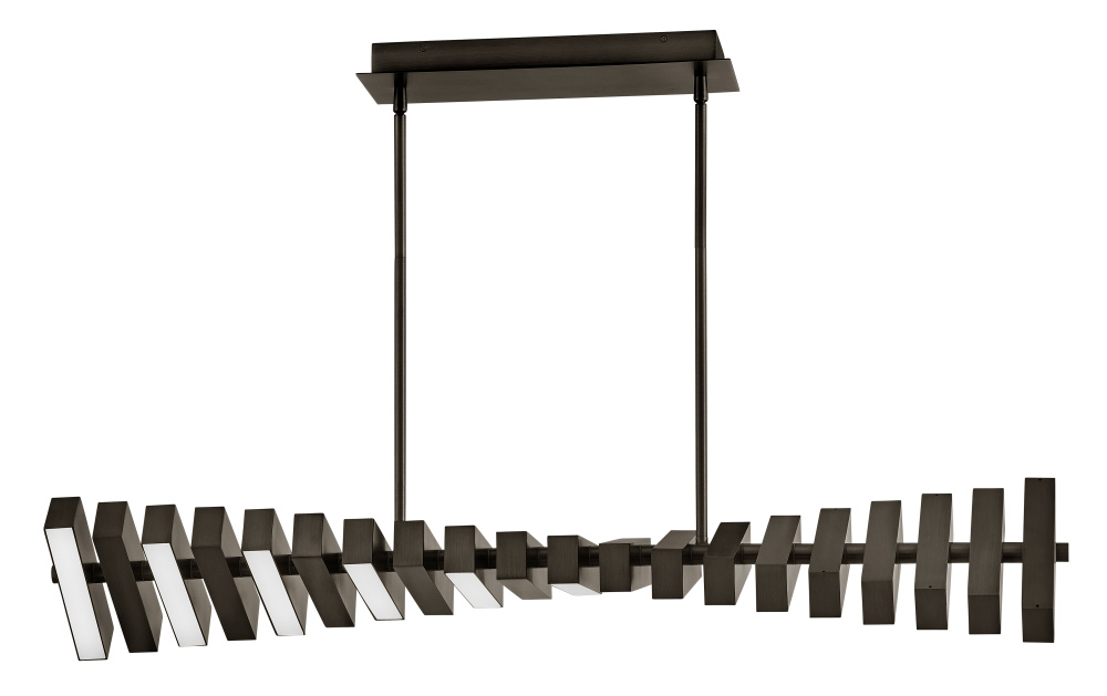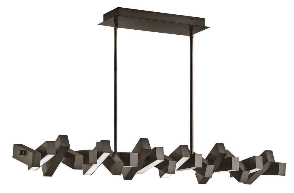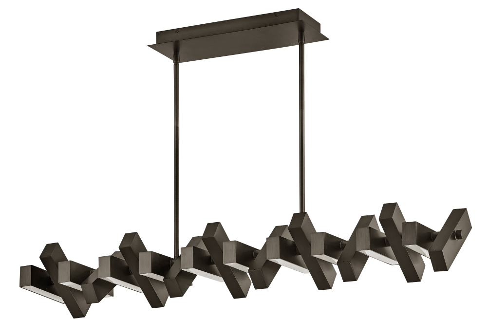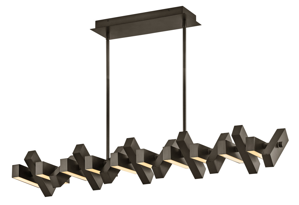 Stitch strikes a pose with an innovative design, offering bountiful illumination from articulating LED panels. This dynamic linear chandelier is a modern sculptural statement available in Black Oxide or Lacquered Brass finishes.