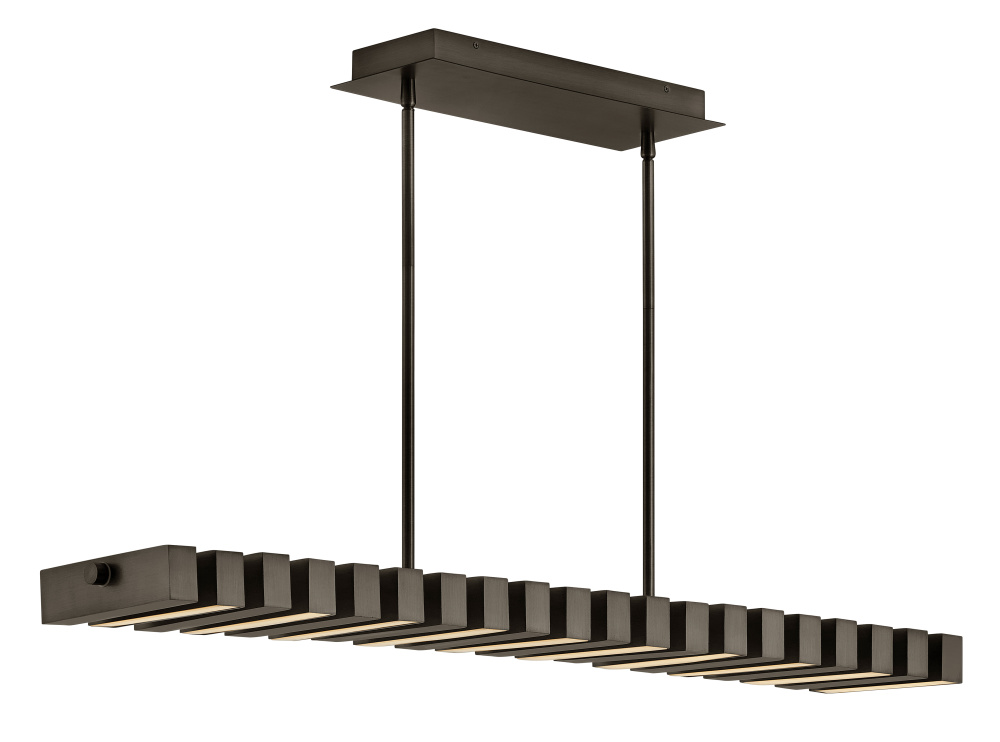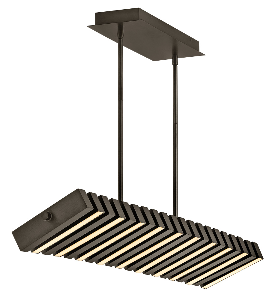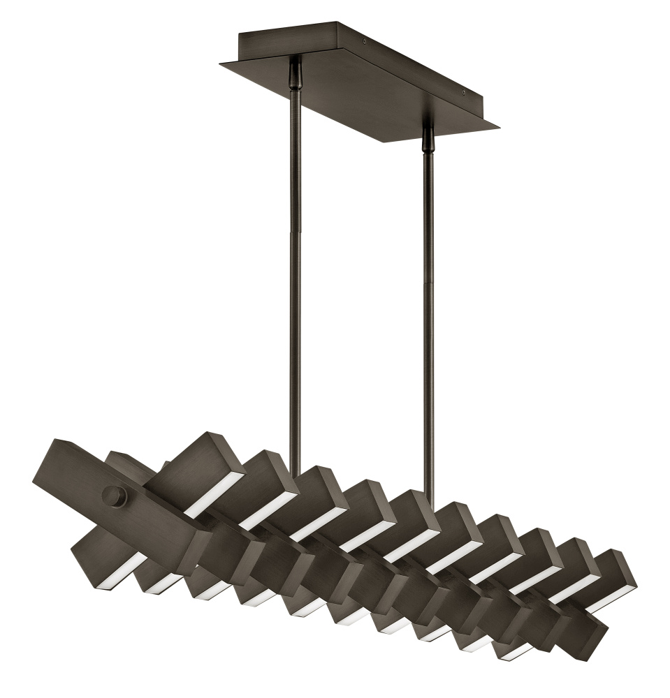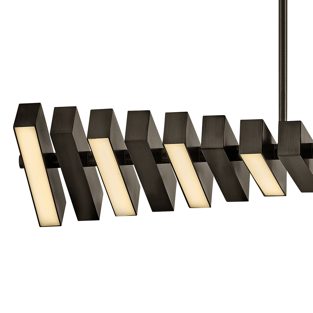 Stitch strikes a pose with an innovative design, offering bountiful illumination from articulating LED panels. This dynamic linear chandelier is a modern sculptural statement available in Black Oxide or Lacquered Brass finishes.
