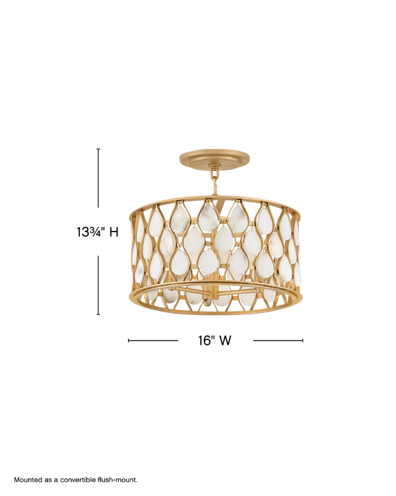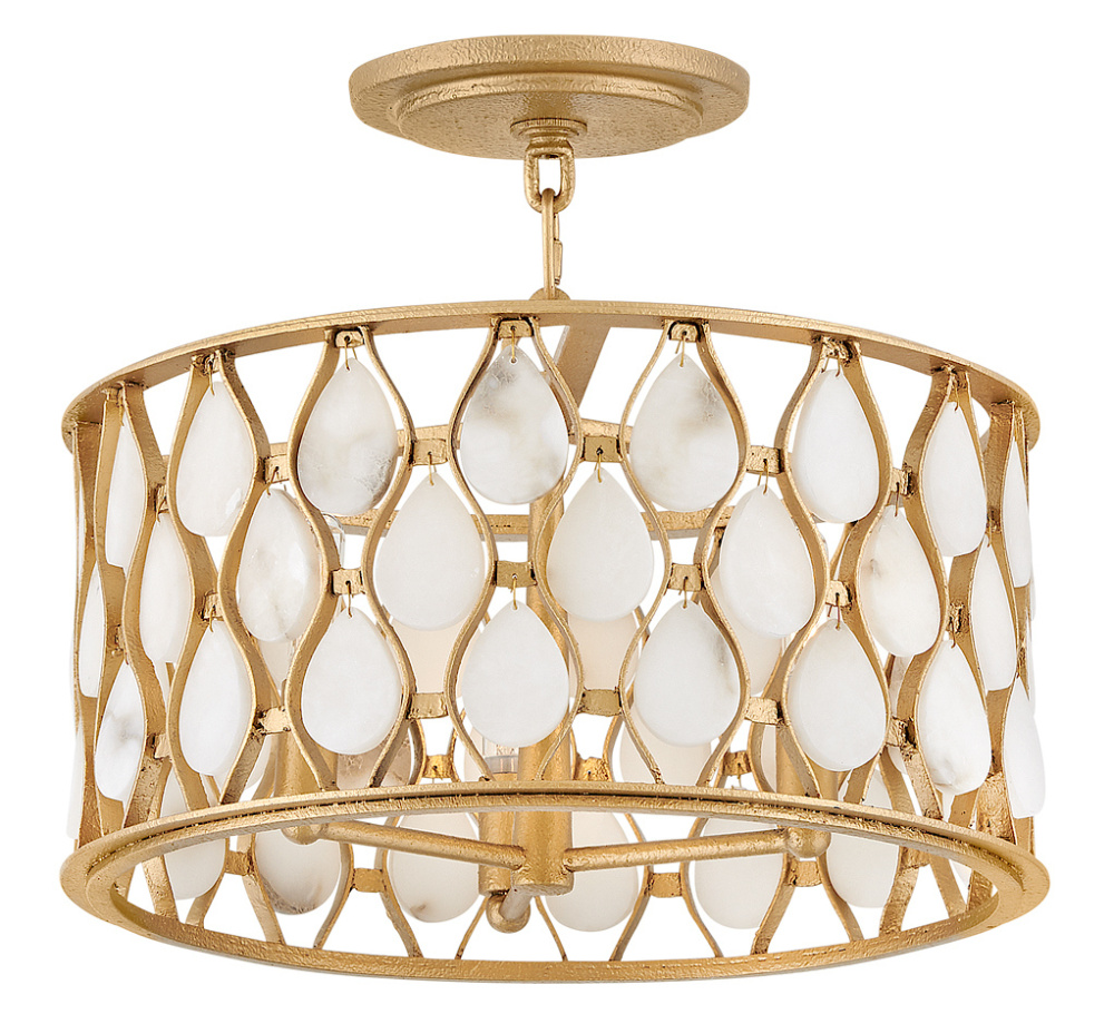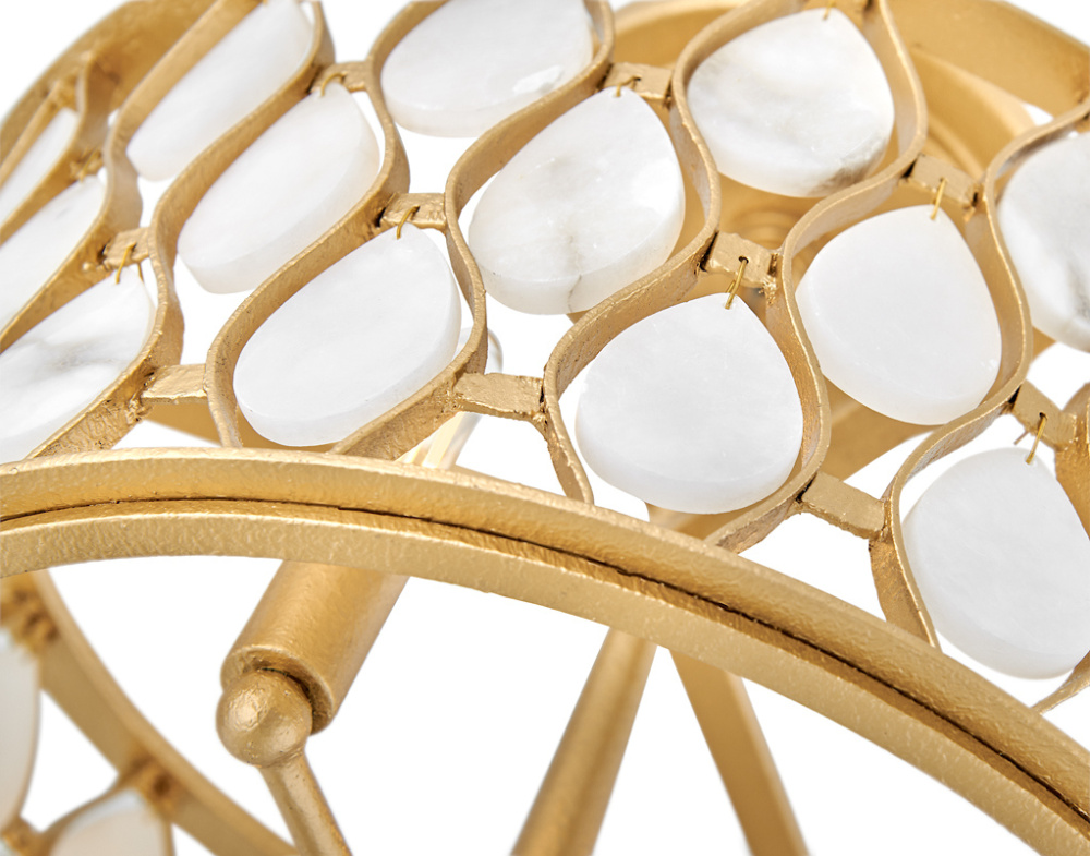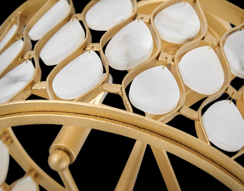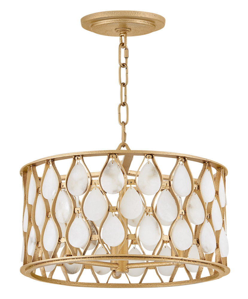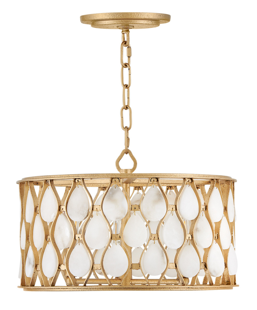 Opulently adorned with natural alabaster stones held within a traditional latticework shade, Estie brings organic elegance to any aesthetic. Intricately curved metalwork complements the frame, chain, and canopy in a textured Piastra Gold finish.