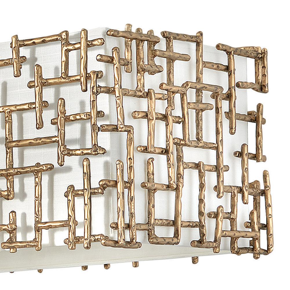 Farrah's contemporary design is bold and sculptural, while achieving an optical airiness. The hand-hammered crosshatch bars gleam in a hand-applied Silver Leaf or Burnished Gold finish with artisanal detailing that carries through to the canopy detail. Set against a White Linen shade, Farrah creates a look of deconstructed; modern elegance.