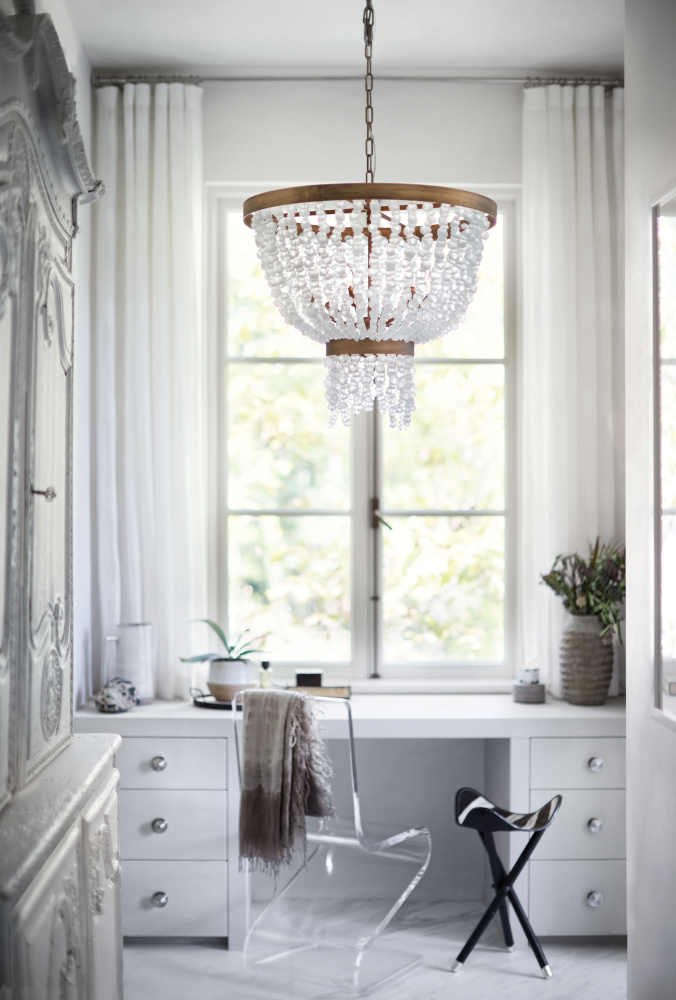 Dune’s bohemian chic design showcases strands of soft white sea glass combined with a Burnished Gold finish. The designs blend a sophisticated silhouette with organic elements inspired by sun and surf. Dune infuses any space with a timeless, mesmerizing elegance.