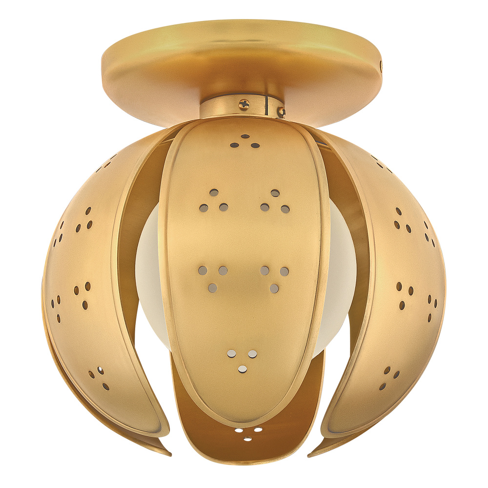 A work of luminary art, Anthos elevates its floral-inspired form with alluring illumination. Raised edge details and distinct perforations accentuate each blossom crafted from solid unlacquered brass petals. Radiant LED lamps enveloped by blown etched opal glass transform the surrounding space with a captivating interplay of light and shadow.