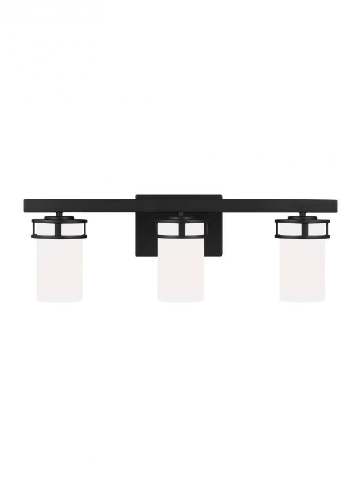 The Robie three light vanity fixture in midnight black provides abundant light for your bath vanity, while adding a layer of today's style to your interior design.