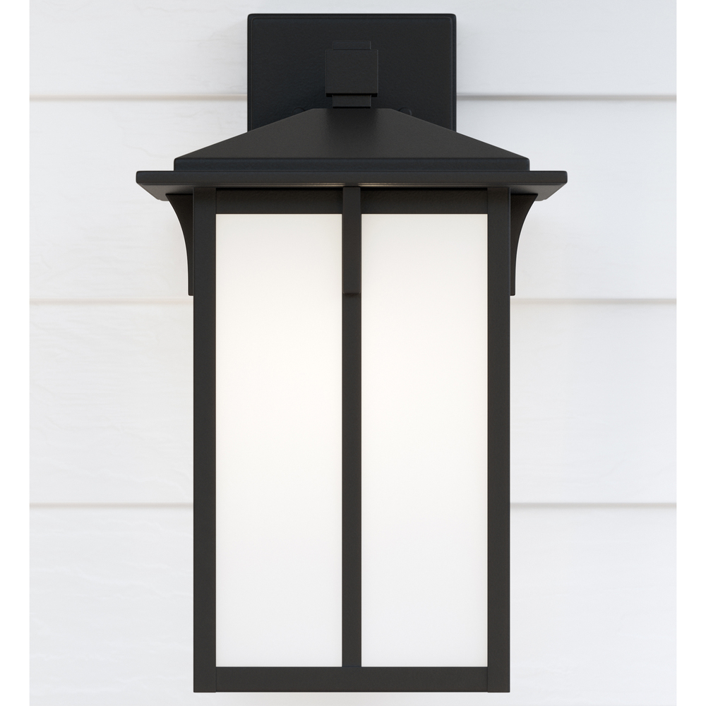 Tomek outdoor offers architectural craftsman's details with a minimalist approach. The frosted glass panels add a chic aspect to the visual depth. Its black or bronze frame is rust-proof as well as fade-resistant, ready to take on whatever the weather, rain or shine, on your porch or patio! The assortment includes a one-light outdoor pendant, small medium, large, and extra-large one-light outdoor wall lanterns, a one-light out door post lantern and a one-light outdoor ceiling flush mount. Both incandescent lamping and ENERGY STAR-qualified LED lamping are available for most of the fixtures, and some can easily convert to LED by purchasing LED replacement lamps sold separately.