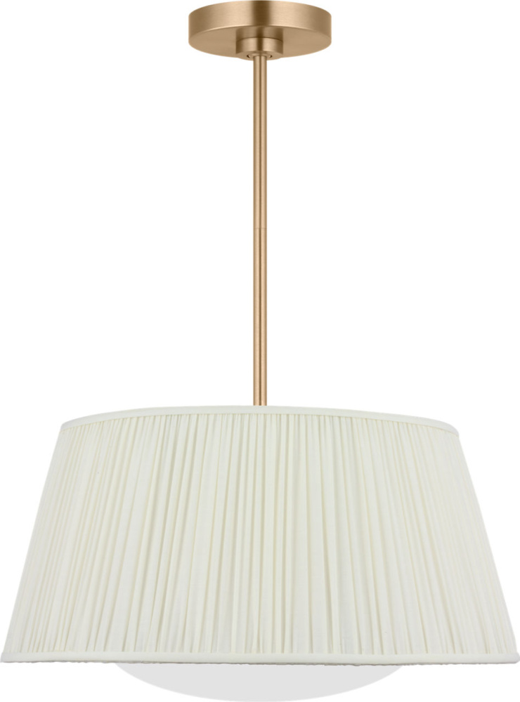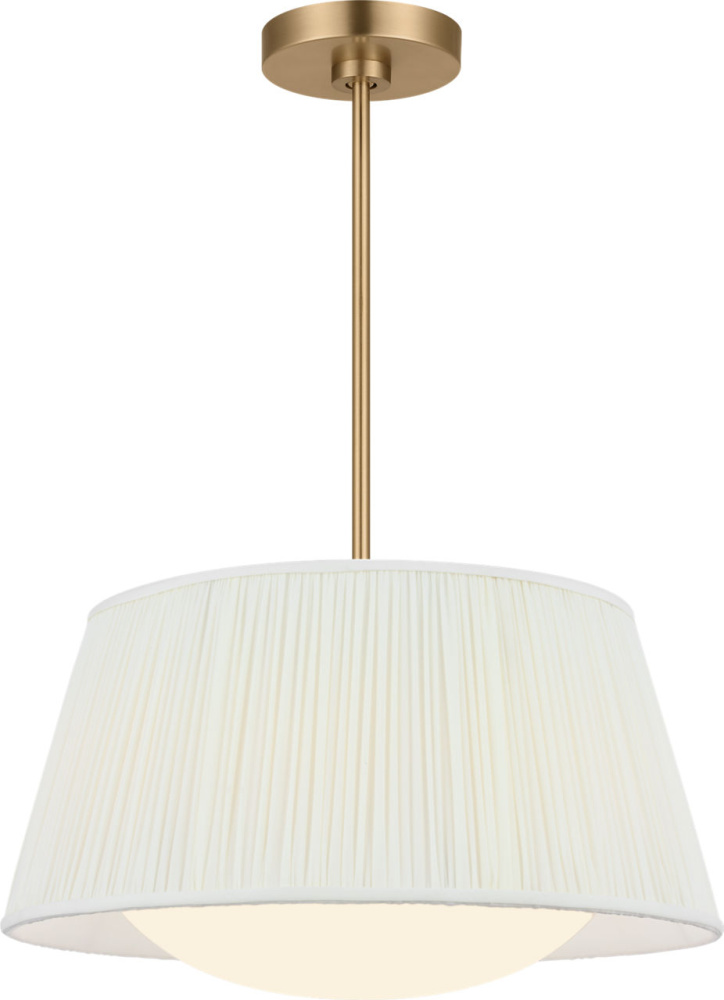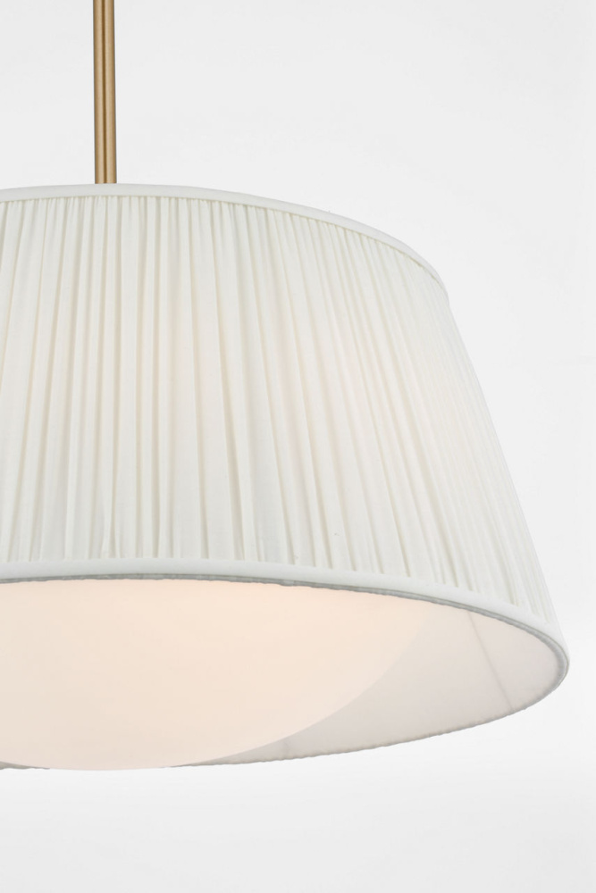 The Vilera Three-Light Pendant suspends a single gathered fabric shade with an integrated diffuser, creating soft general illumination with a relaxed character. Ideal over kitchen islands, dining tables, or as a pair in larger spaces, the pendant balances simplicity with tactile expression.