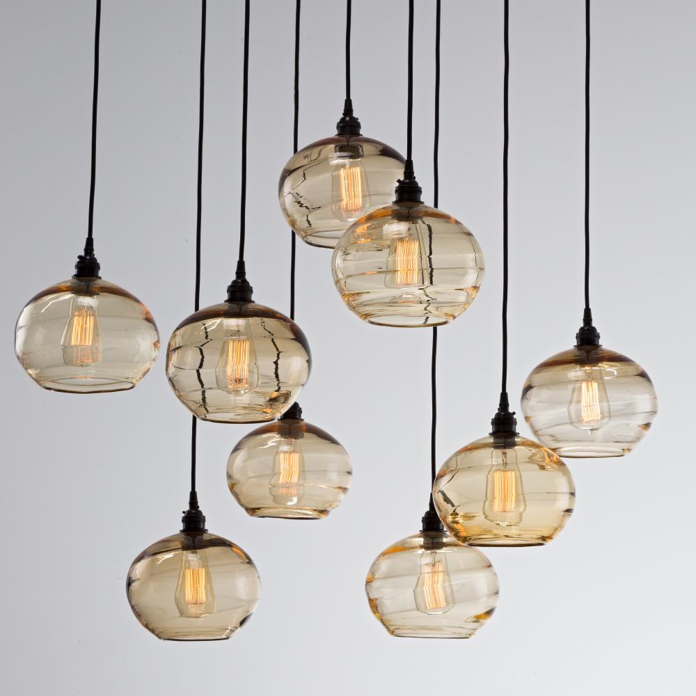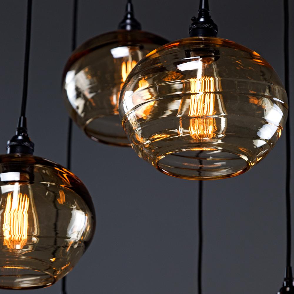 Coppa Square Multi - Port - Metallic Beige Silver - Amber Optic Blown Glass - Cloth Braided Cord - Incandescent E26 Socket