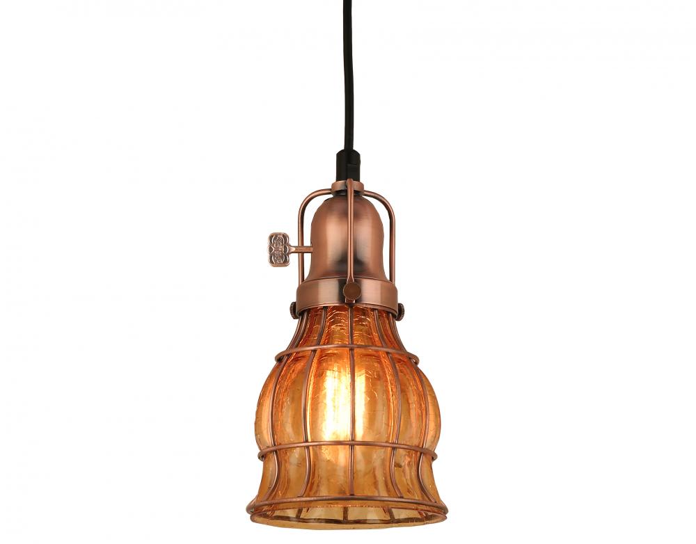 8 ft Black Cord Hung Pendant Hung Pendant, Weathered Copper Finish, Amber Crackle Glass