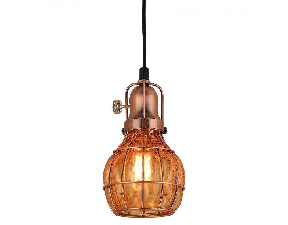 8 ft Black Cord Hung Pendant, Weathered Copper Finish, Amber Crackle Glass