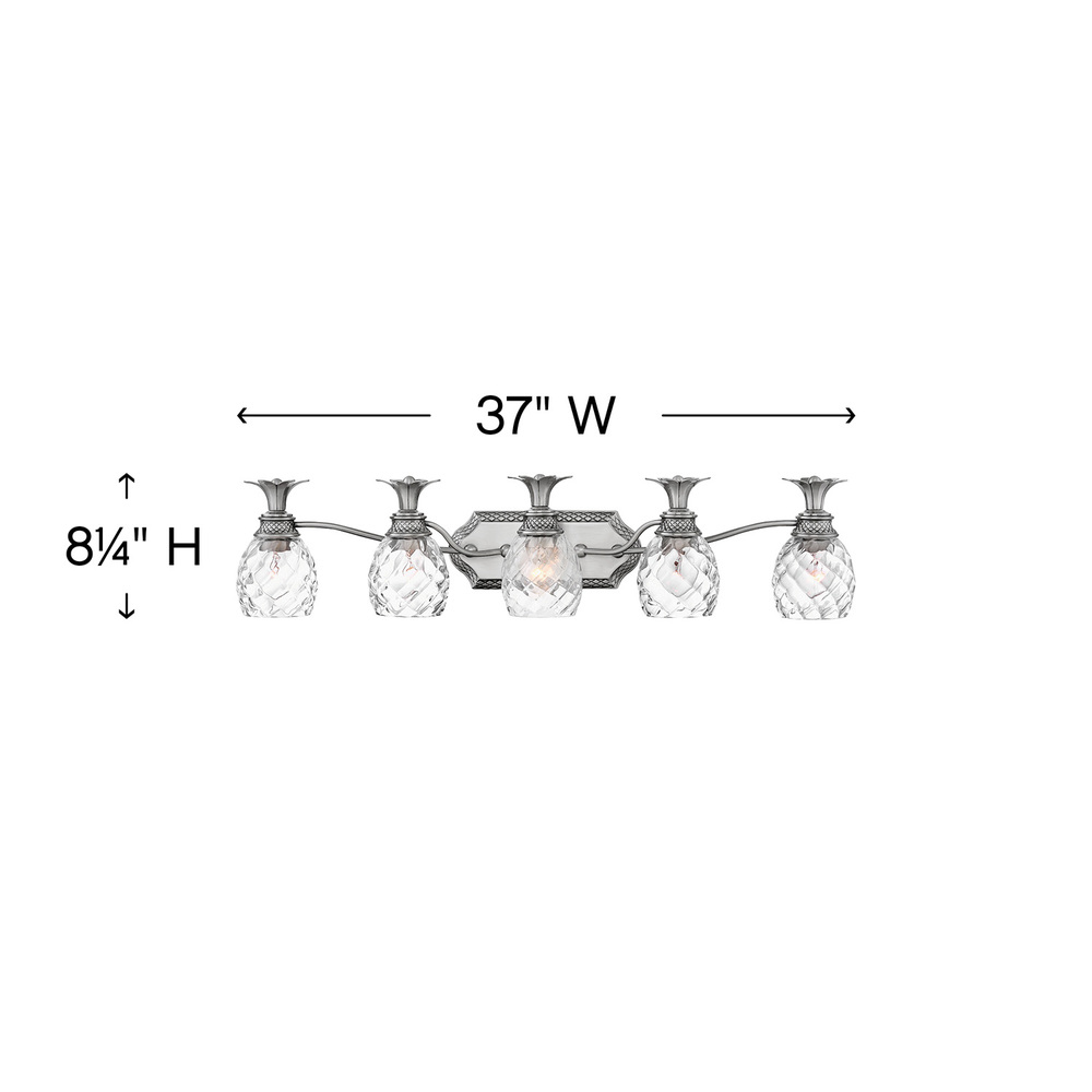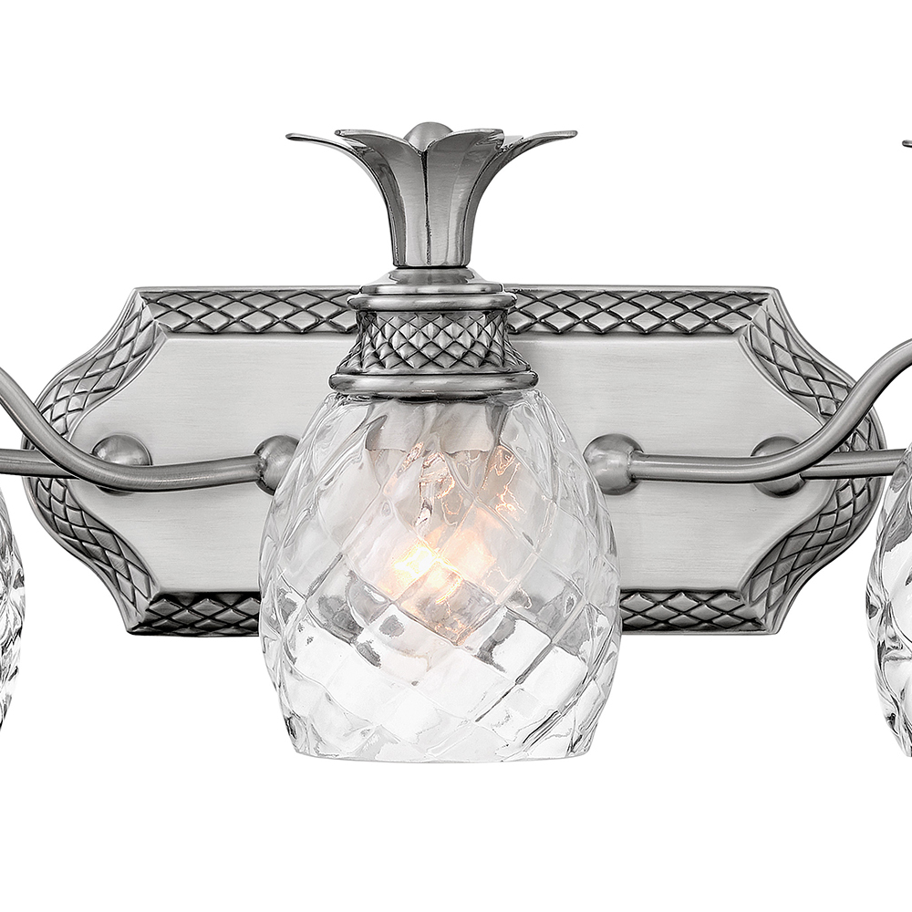 A Hinkley classic, the ornate Plantation collection features exceptional pineapple shaped, clear optic glass that makes a noble statement. The elaborate, decorative cast detailing is accentuated by its lush finish.