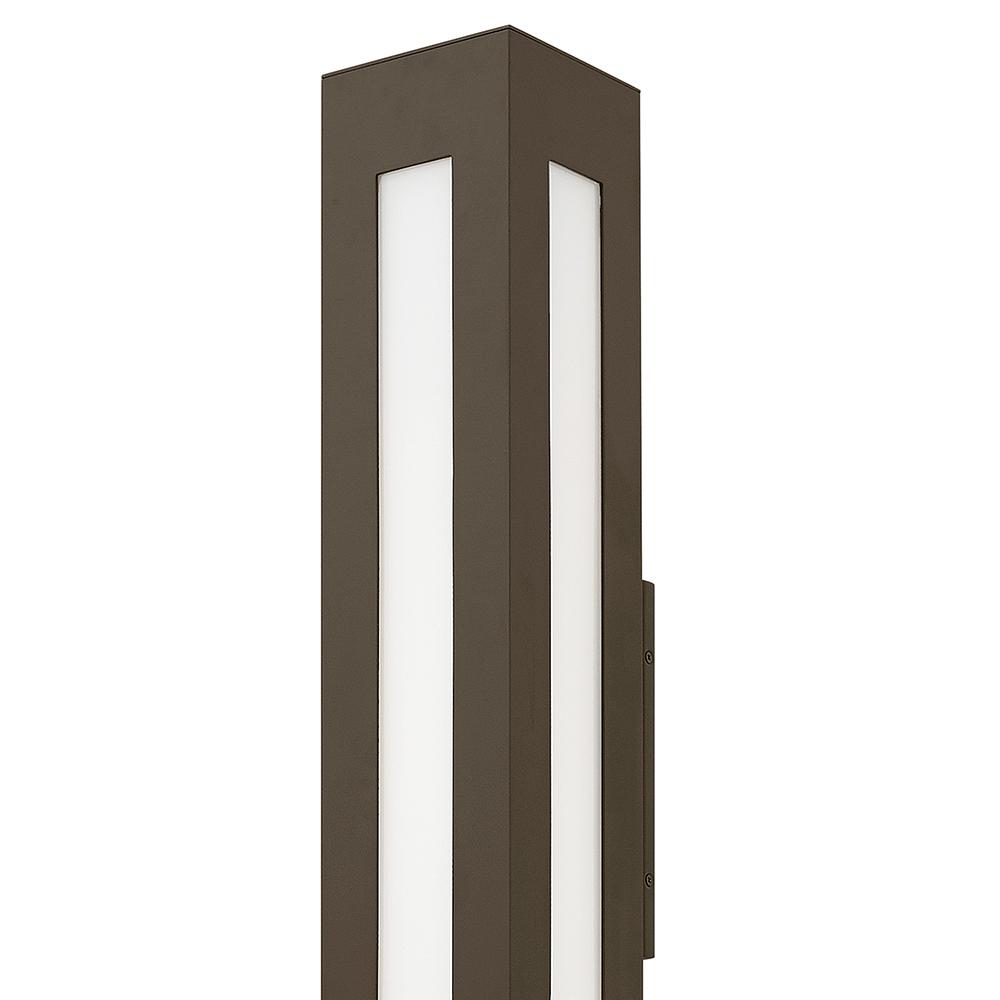 Dorian’s robust design in durable aluminum construction is offered in a Bronze finish. This contemporary fixture allows light to emit from white glass windows.