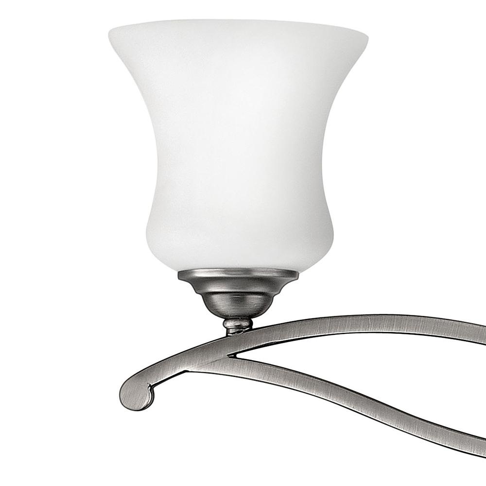 Brooke's updated traditional look features a minimalist forged scroll design in Antique Nickel and Olde Bronze that elegantly complements its etched opal glass.