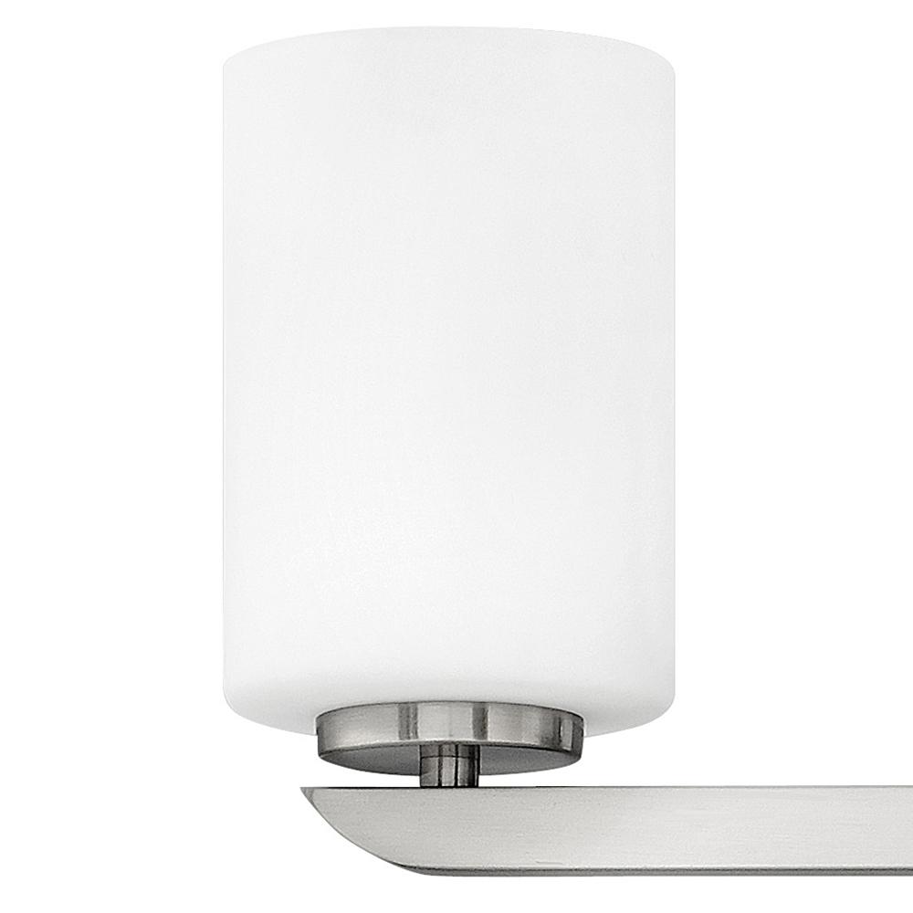 Clean and crisp, Kyra's minimalist design is anchored with a bold yet simple aesthetic. The sleek cross bar ends with a subtle curve for an element of softness. Rich finish options of Brushed Nickel or Polished Nickel complement the elegant etched opal glass.