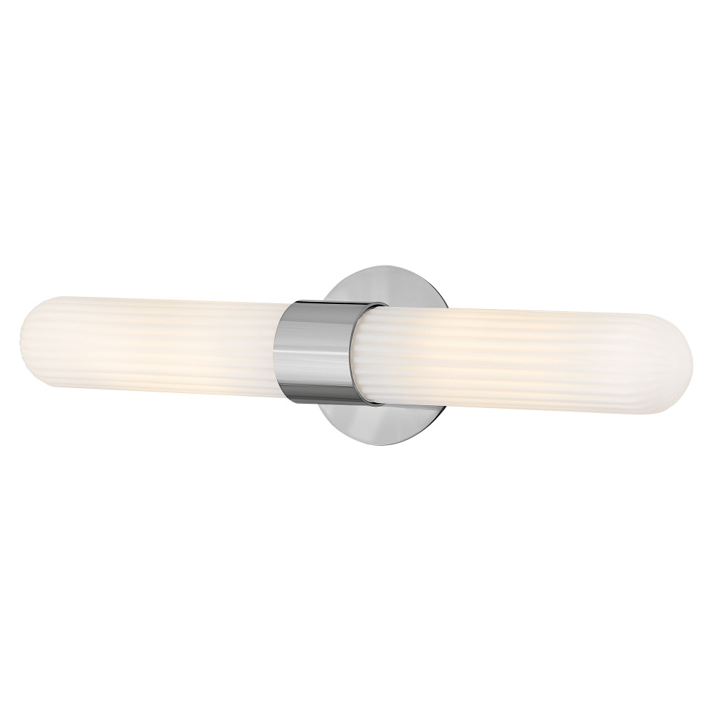 Blending transitional modern style with plenty of functional illumination, Nina is crafted to add a timeless accent to your bath or living space. Rounded Cased Opal glass shades with ribbed detailing glow beautifully, casting warm, even light throughout the surrounding room. A metal backplate and flared arm are finished in Black, Chrome, or Lacquered Brass to complement any decor effortlessly.