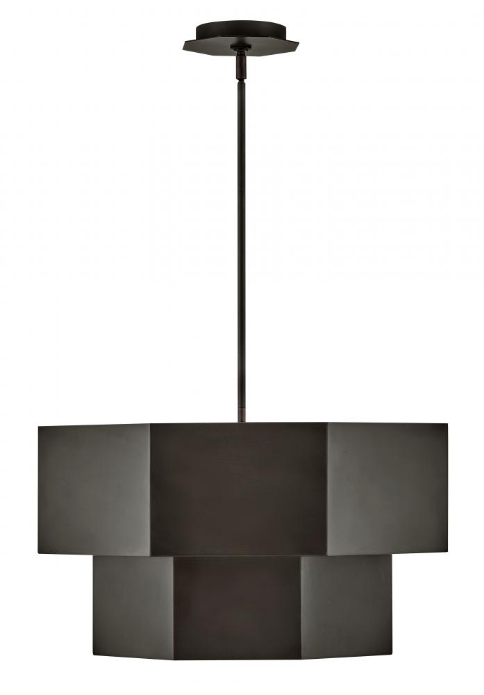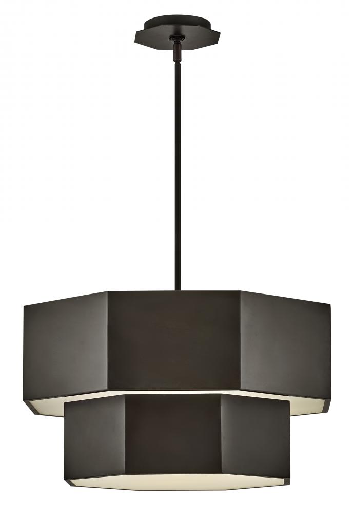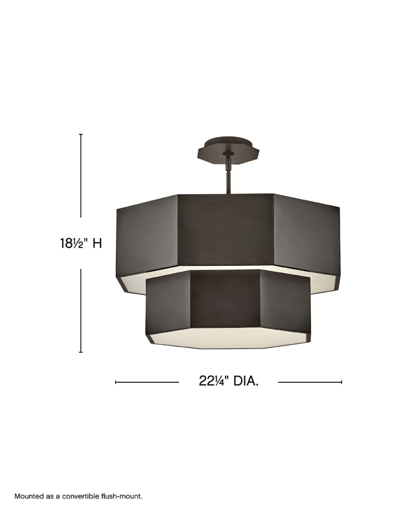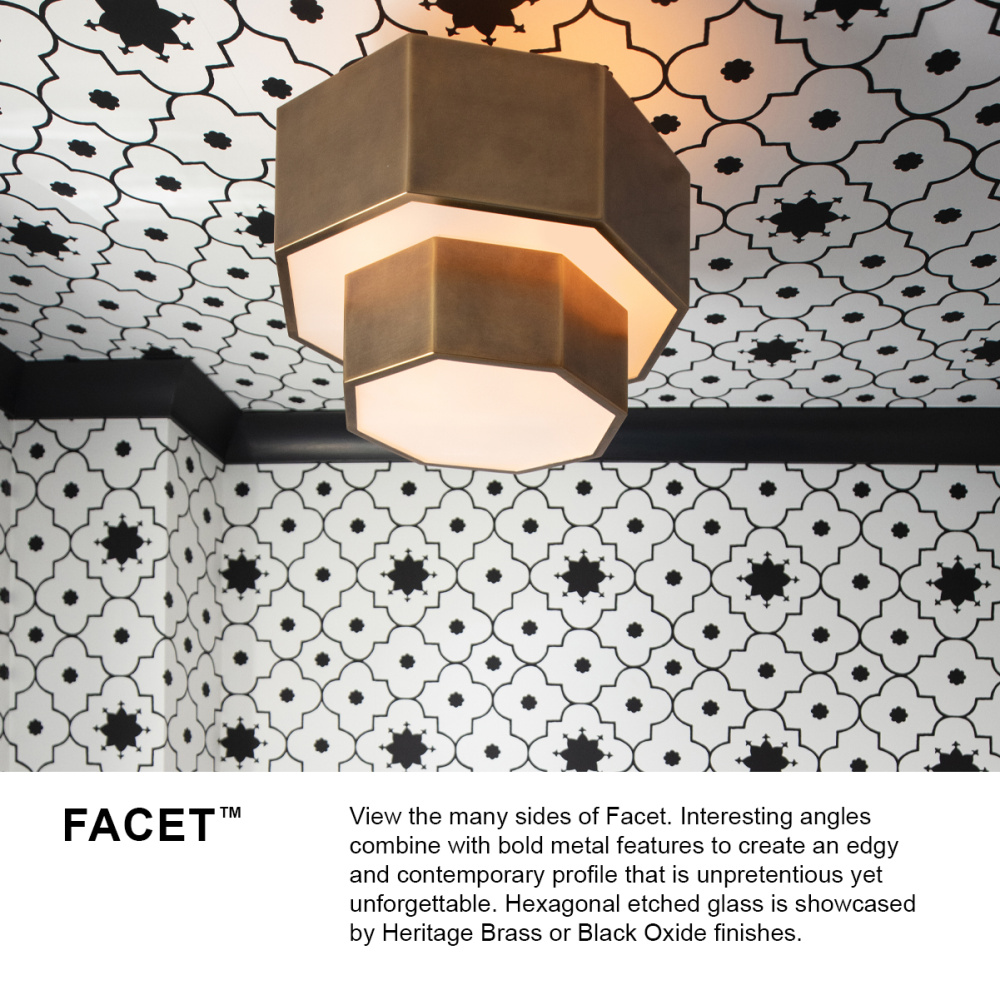 View the many sides of Facet. Interesting angles combine with bold metal features to create an edgy and contemporary profile that is unpretentious yet unforgettable. Hexagonal etched glass is showcased by Heritage Brass or Black Oxide finishes.