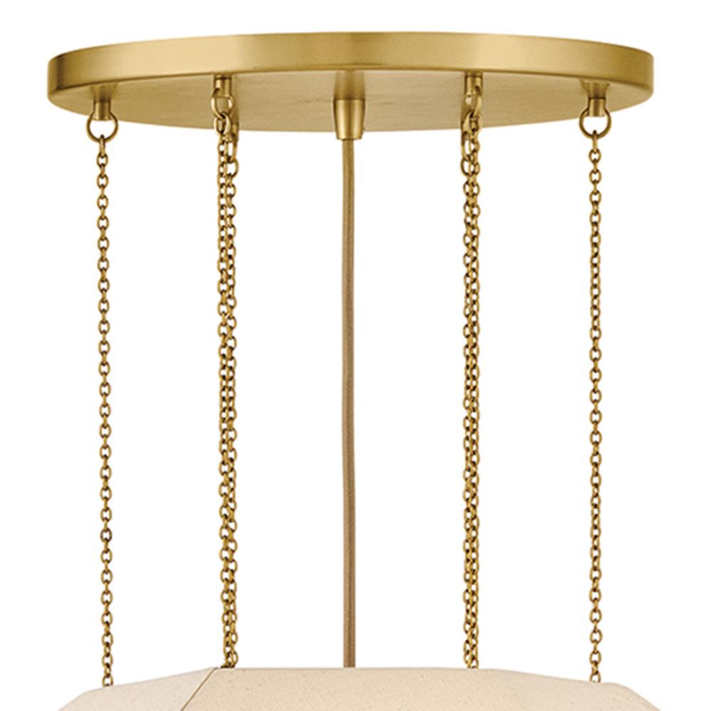 Elegant yet edgy, Lyla’s geometric Oatmeal Linen shade with a textured, wrapped middle band is suspended from refined Lacquered Brass micro-chains – inspired by delicate jewelry designs. A Lacquered Brass canopy and dimmable lamping add subtle warmth and a sophisticated atmosphere to the surrounding space.