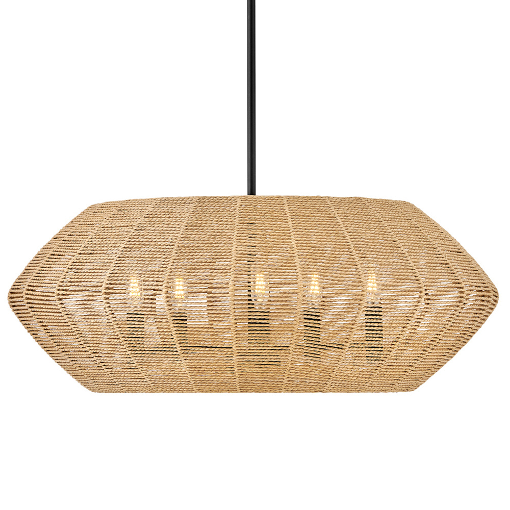 Luca's coastal vibe is permeated with a slightly exotic edge. The bold pendant showcases a robust, woven drum shade, and a full finished cluster for plenty of functional light offered in a variety of finish options. Luca is part of the Lisa McDennon Collection.