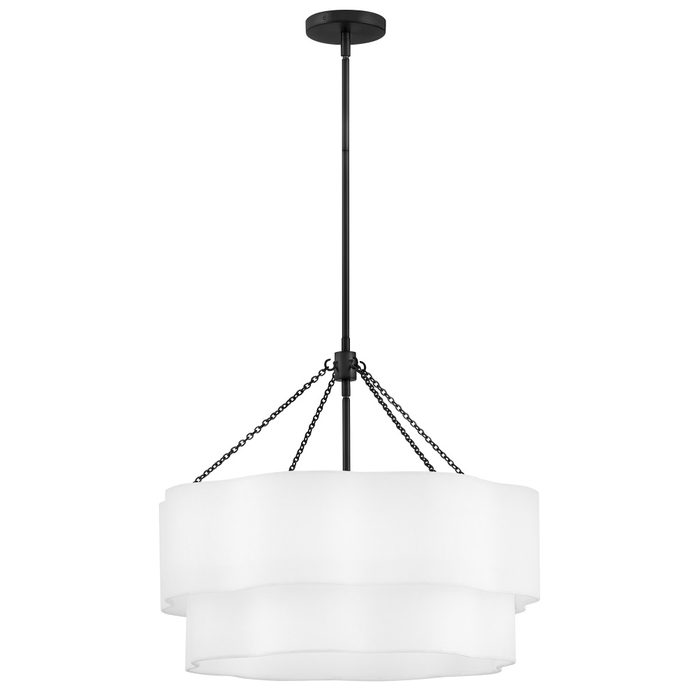 Splendidly soft, Gwen’s shapely scalloped shade complements inviting light with layers of Off-White Linen suspended from delicate chains and minimal metal stems. A Black or Lacquered Brass finish provides a versatile complement to any interior style.