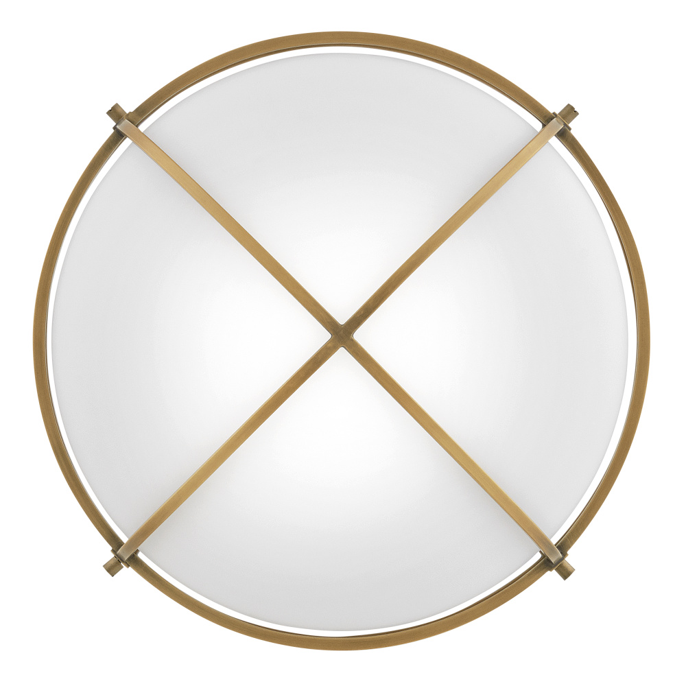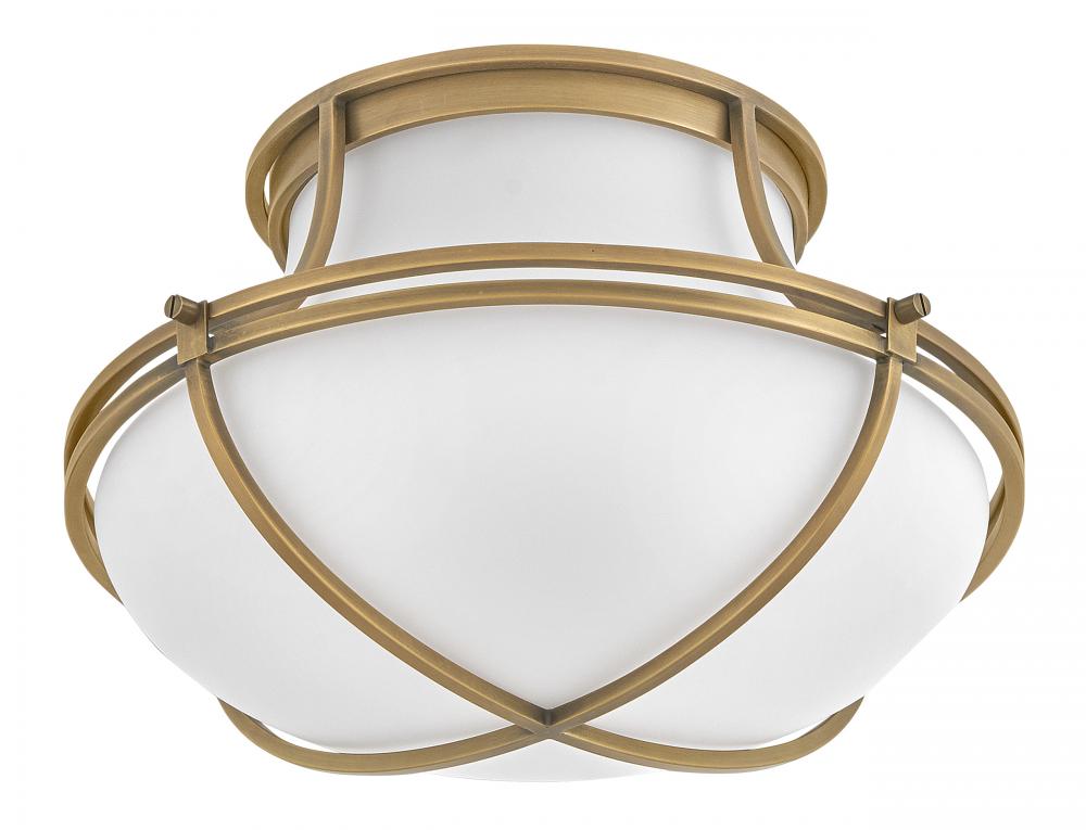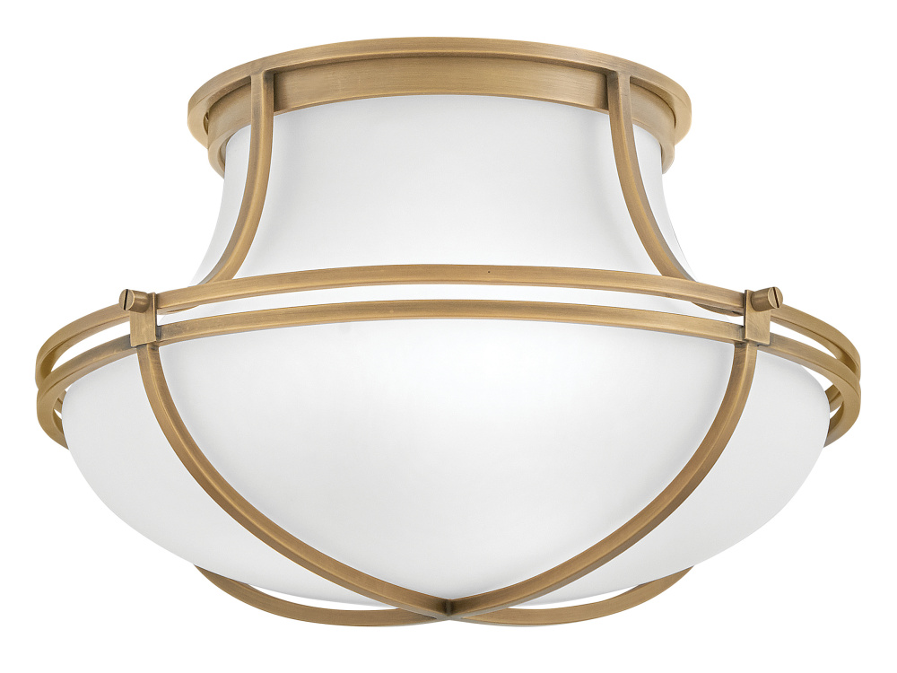 Saddler’s sculptural tear-drop dome forms a chic silhouette accentuated by decorative metal straps. Etched opal glass complemented by a Heritage Brass or Black finish creates a versatile design with high style.