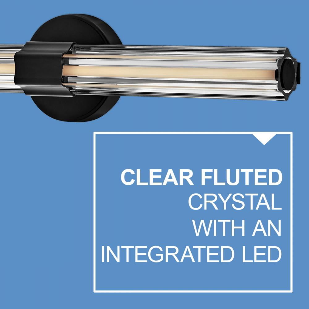 Georgette’s sophisticated silhouette is enhanced by clear fluted crystal, creating a stunning fixture with bold symmetry and captivating details. A chic central cuff and back plate provide balance and contrast that effortlessly complements any space with a Black Oxide or Lacquered Brass finish.