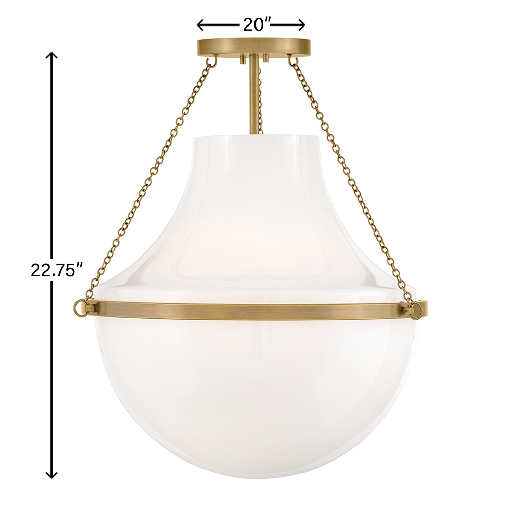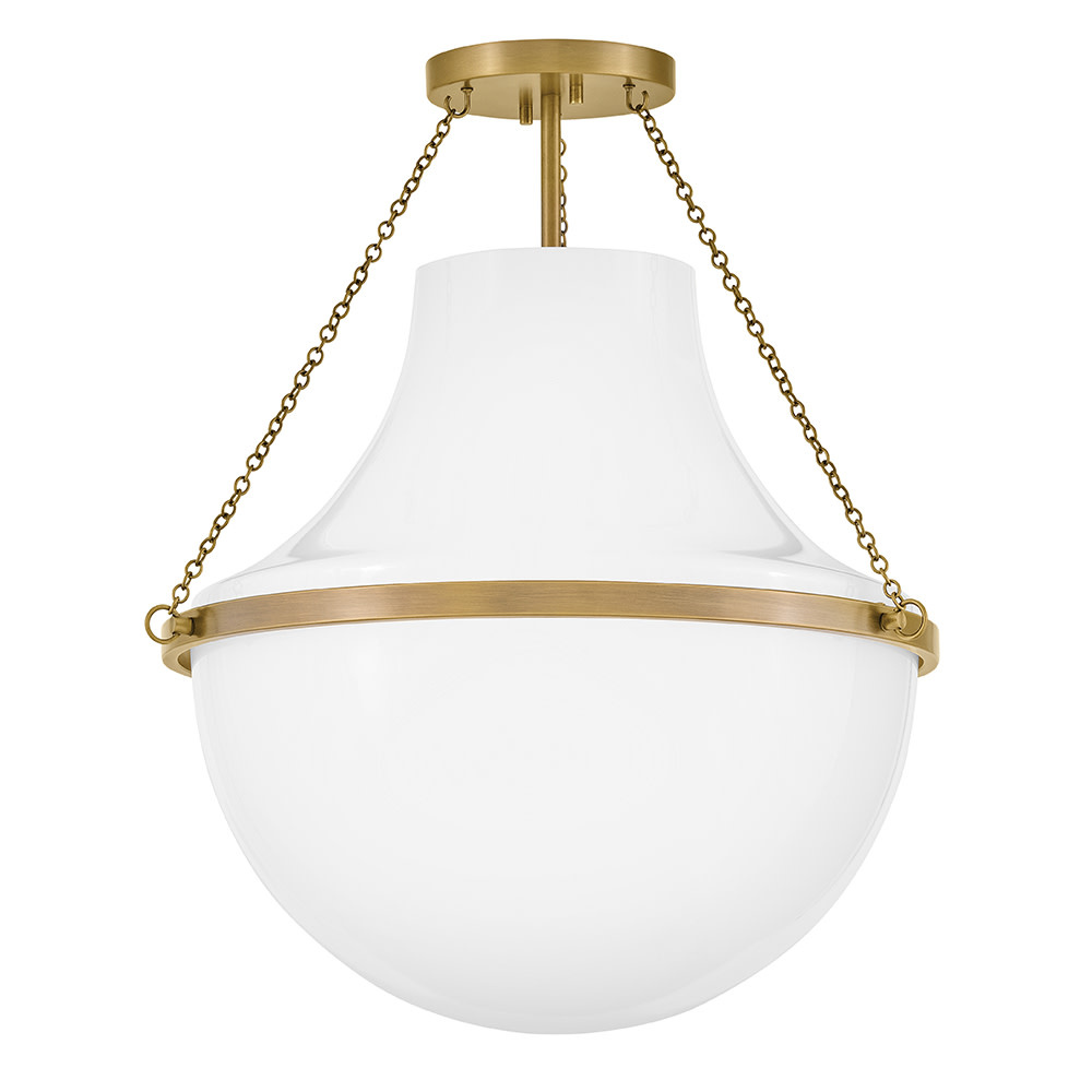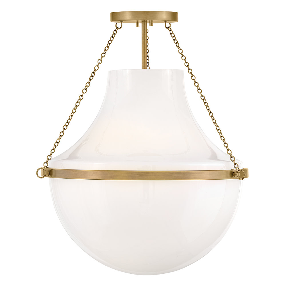 Fusing a sculpted, modern form with classically styled details, Collins features a transitional teardrop shade crafted from blown, cased opal glass. A central metal band and delicate chain uprights are available in Heritage Brass or Black Oxide finishes.