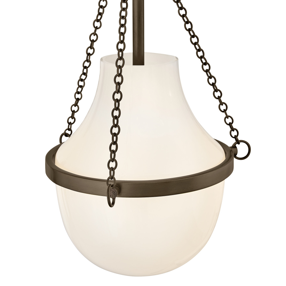 Fusing a sculpted, modern form with classically styled details, Collins features a transitional teardrop shade crafted from blown, Cased Opal glass. A central metal band and delicate chain uprights are available in Black Oxide, Heritage Brass, Heritage Bronze, or Polished Nickel finishes.