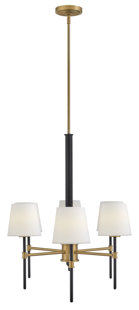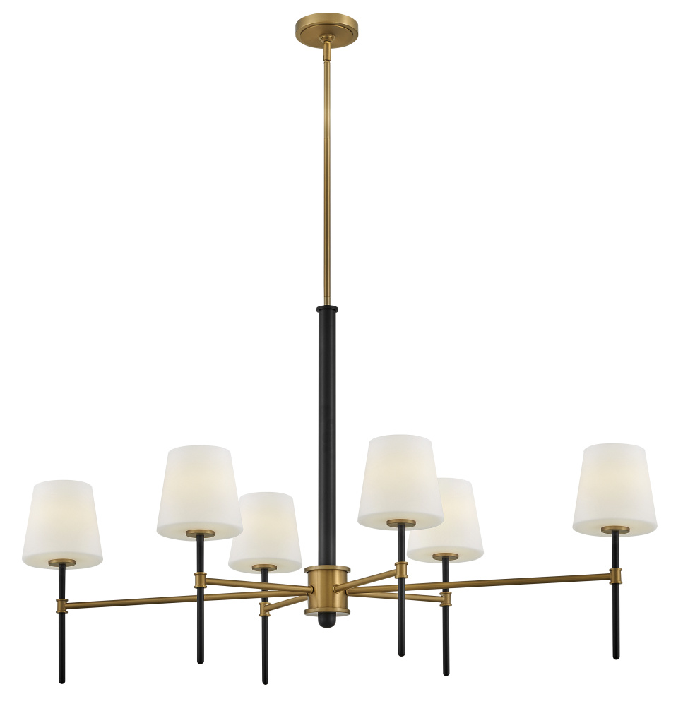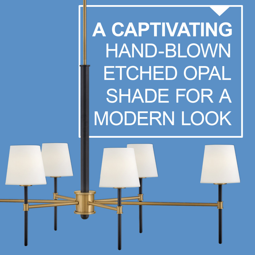 Saunders boasts a striking yet effortless appeal, blending traditional elements with captivating, mid-century modern details. A spoked silhouette and decorative stem holders are finished in Black and Lacquered Brass, paired with blown, etched opal glass shades.