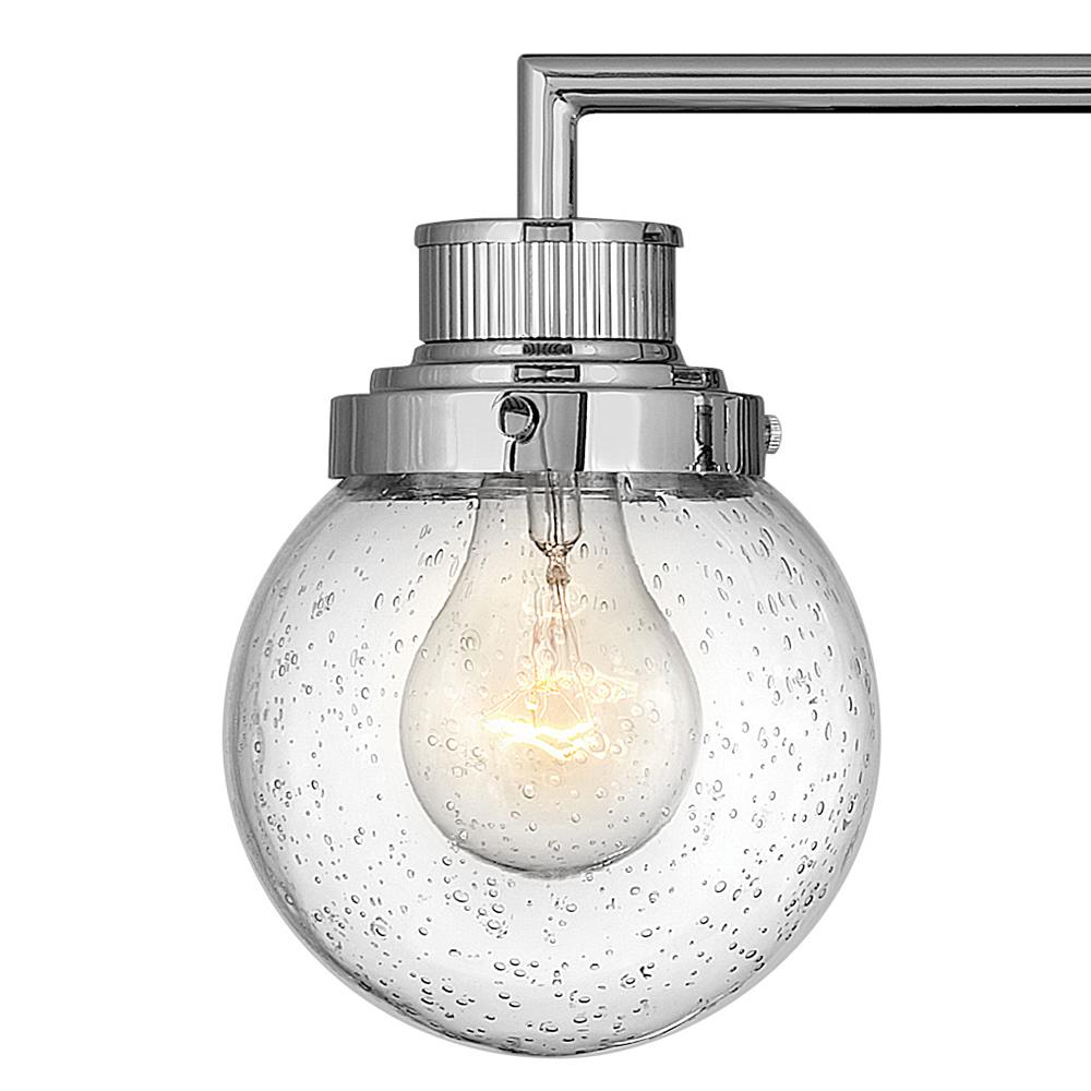 Poppy features clear glass spheres that bubble out of the refined, ribbed Chrome or Heritage Brass fitters to create a simple, yet sophisticated silhouette. An elegant, stepped backplate and crisp crossbar anchor this airy design. Poppy showcases mid-century style with a spectacular spin.