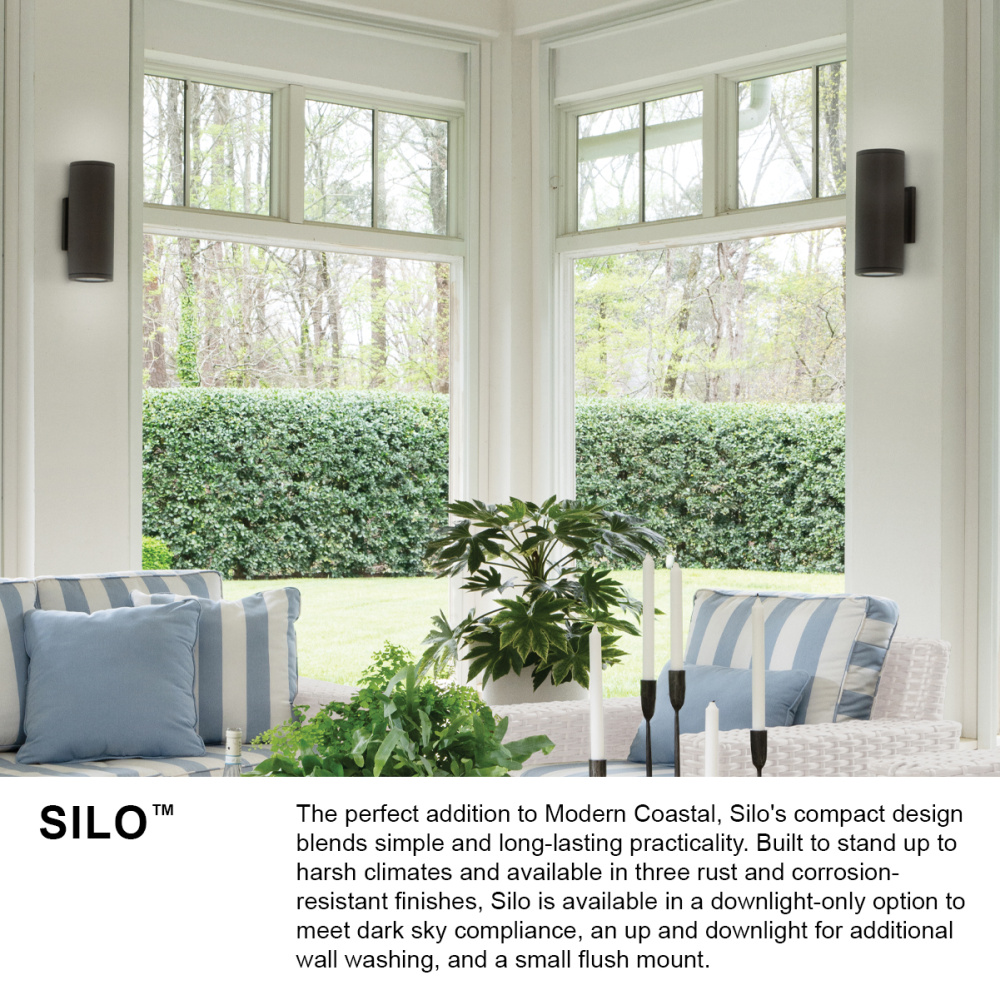 The perfect addition to Modern Coastal, Silo's compact design blends simple and long-lasting practicality. Built to stand up to harsh climates and available in three rust and corrosion-resistant finishes, Silo is available in a downlight-only option to meet dark sky compliance, an up and downlight for additional wall washing, and a small flush mount.